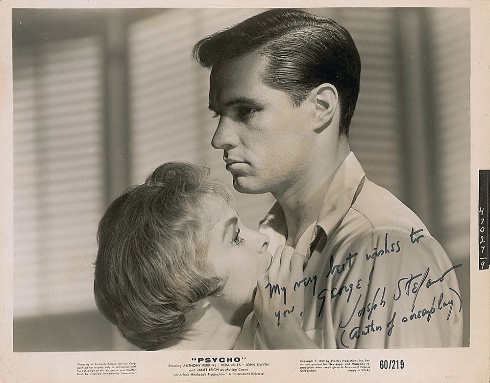 Glossy 10 x 8 promotional photo for Psycho, signed and inscribed in black felt tip, “My very best wishes to you, George, Joseph Stefano (author of screenplay).” Scattered creases and light areas of toning to their faces, otherwise fine condition.