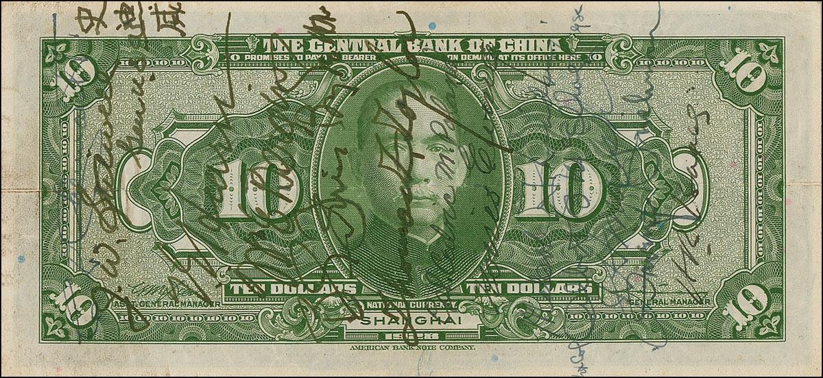 Chinese 10 dollar ‘short snorter’ bank note from 1943, signed in ink on both sides by 25 including Joseph Stillwell, twice by Claire Chennault, Major General William Edward Bergin, Chief of Staff Chinese training and combat command China; Major General Thomas Hearn, Chief of Staff USAF 14th Air Force, China, Burma, India theater of operations; Brigadier General Benjamin Ferris, Deputy Chief of Staff US army forces, China Burma India (CBI) theater of operations, and others, most likely staff members. In very good condition, with light to moderate contrast to some of the signatures, and scattered light toning and soiling. A very interesting piece of history, these autographs were signed in September 1944 in Kunming China. Stillwell was made a four star General in August and then relieved of command in October 1944.