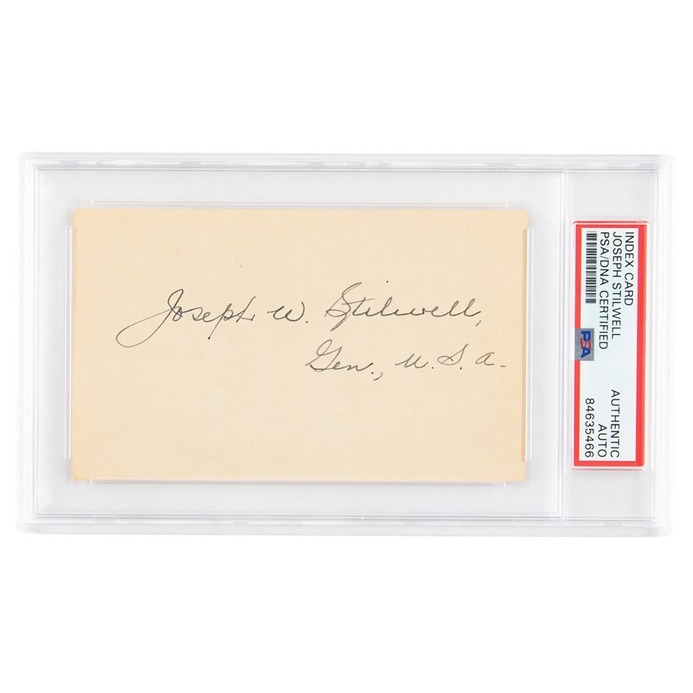 Four-star general (1883-1946), aka & lsquo;Vinegar Joe& rsquo; and & lsquo;Old Joe,& rsquo; best known for his service in China. Relieved from command in 1944 as part of FDR& rsquo;s geopolitical maneuvering in Asia, Stilwell was reassigned to command the American ground forces during the final battle for Okinawa in 1945. Ink signature, "Joseph W. Stilwell, Gen. U.S.A.,& rdquo; on an off-white 5 x 3 card. In very fine condition. Encapsulated in a PSA/DNA authentication holder.