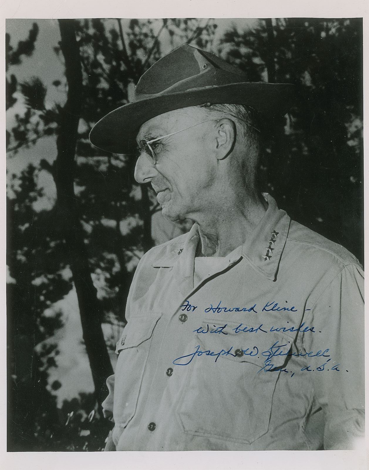 Vintage glossy 7.5 x 9.5 photo of the four-star Army General in near-profile, signed and inscribed in fountain pen, "For Howard Kline—with best wishes, Joseph W. Stilwell, Gen., U.S.A.” In very good to fine condition, with scattered creasing, a paperclip impression to the top edge, and a light horizontal bend.
