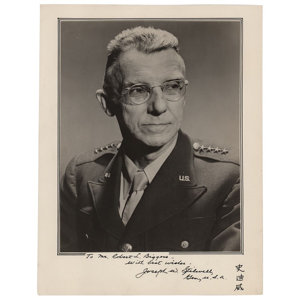 Vintage matte-finish 8.5 x 11 head-and-shoulders photo of Stilwell in uniform, signed and inscribed in the lower border in fountain pen, "To Mr. Robert L. Biggers, with best wishes, Joseph W. Stilwell, Gen., U.S.A.†In fine condition.