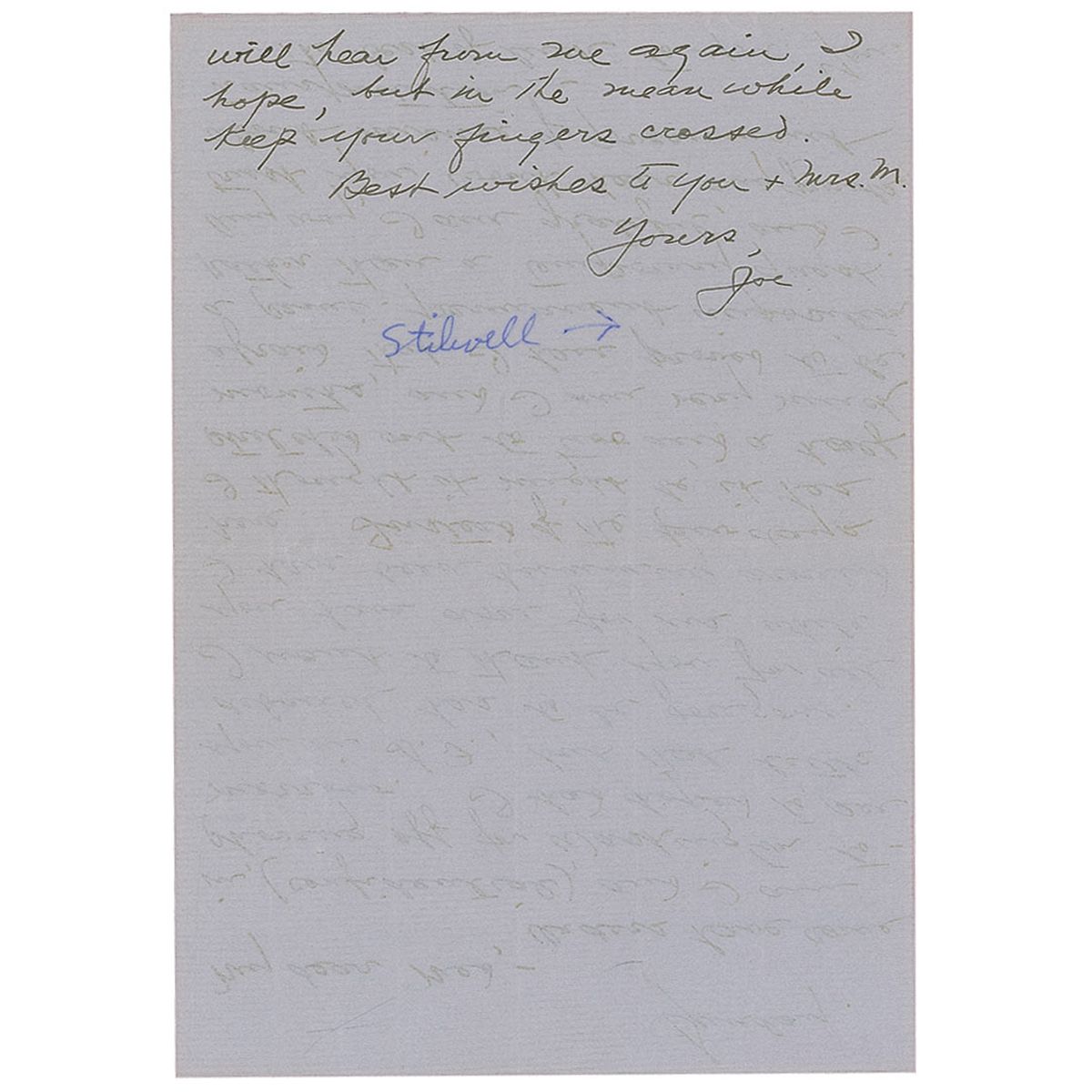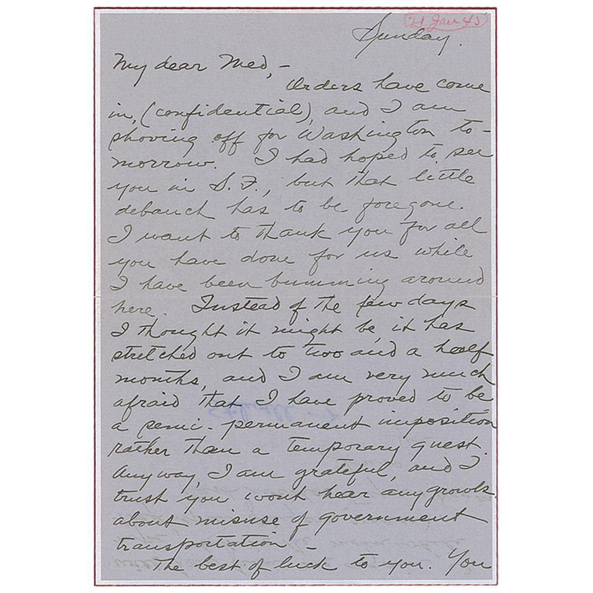War-dated ALS signed “Joe,” one page both sides, 5.25 x 7.5. To Med. In part: “Orders have come in, (confidential), and I am shoving off for Washington tomorrow…I want to thank you for all you have done for us while I have been bumming around here. Instead of the few days I thought it might be, it has stretched out to two and a half months, and I am very much afraid that I have proved to be a semi-permanent imposition rather than a temporary guest…The best of luck to you. You will hear from me again, I hope, but in the mean while keep your fingers crossed.” In fine condition, with scattered surface creasing, and two separate notations in another hand, one in pencil and one in ink. Accompanied by original mailing envelope, postmarked January 21, 1945.