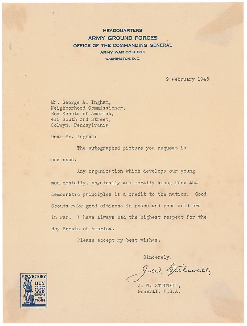 TLS signed “J. W. Stilwell,” one page, 7 x 9.25, Headquarters, Army Ground Forces letterhead, February 9, 1945. Letter to a Boy Scout Commissioner. In part; “Any organization which develops our young men mentally, physically and morally along free and democratic principles is a credit to a nation. Good Scouts make good citizens in peace and good soldiers in war.” Uniform toning, a bit heavier to corners due to mounting remnants on reverse, otherwise fine condition.