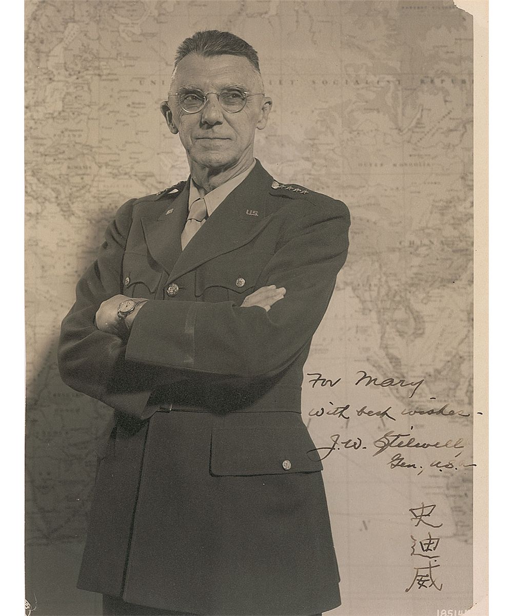 Great matte-finish 7 x 9.5 photo of Stilwell posing with his arms crossed against a world map background, signed and inscribed in fountain pen, “For Mary, with best wishes—J. W. Stilwell, Gen U. S,” adding Japanese characters below. In fine condition, with small areas of surface loss to corner tips and trimmed edges. An excellent pose of the general in uniform.