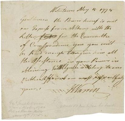 Autograph letter signed ''JWarren'' dated 5 May 1775, shortly after Lexington & Concord, where Warren fought and before Bunker Hill, where he was killed. In this letter, Warren references the Committee of Correspondence; it was as leader of this Committee that Warren sent Paul Revere on his historic Midnight Run only a few weeks earlier. Letter reads in full, ''Watertown May 5 1775 / Gentlemen - the Bearer hereof is sent on express from Albany with the Letter for the Committee of Correspondence you [sic] will be kind enough to give him all the assistance in your power in obtaining intelligence relating to our public affairs. I am most respectfully yours. JWarren''. Trained as a physician, Warren was one of the most vociferous critics of England and enthusiastic supporters of America's cause. Before his death, he was appointed a Major General and President of the Massachusetts Provincial Congress, the highest position in the revolutionary government. Barely escaping death at Lexington & Concord, he volunteered to fight at Bunker Hill where he perished, but not before reportedly declaring, ''These fellows say we won't fight! By Heaven, I hope I shall die up to my knees in blood!'' Because of his early death, letters in his hand are extremely scarce -- this being only one of seven known to exist. Letter measures 6.25'' x 6''. Lightly soiled with some ink smudging. Rough bottom edge. In light blue cloth folding-case with blue morocco spine and cream silk interior. Very good condition.