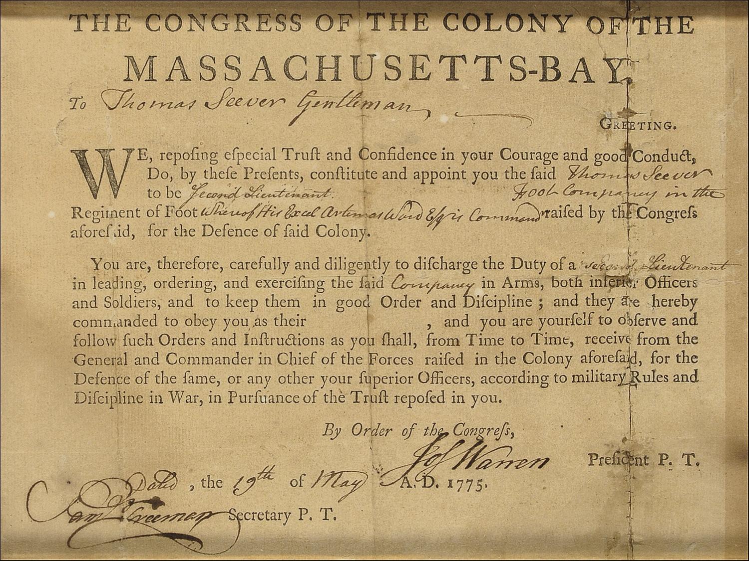 Written exactly one month to the day after he sent Paul Revere on horseback to warn the patriots that the British were coming...just a month after the Battles of Lexington and Concord launched the American Revolution...Warren bestowed this military commission upon Seever, a Minute Man who was third in command of his outfit and marched in the Lexington Alarm. Warren’s order to Seever was simple—to rally Minute Man volunteers and prepare them to fight—”leading, ordering, and exercising the said Company...Officers and Soldiers...commanded to obey you.” Warren, an influential patriot, would encounter Seever later at Bunker Hill—ironically, the place where Warren would meet his demise. After heavy fighting, the American fortifications were overrun by the British and Warren was killed by a British musketball while attempting to rally the militia. Superlative item from the start of America’s fight for freedom.