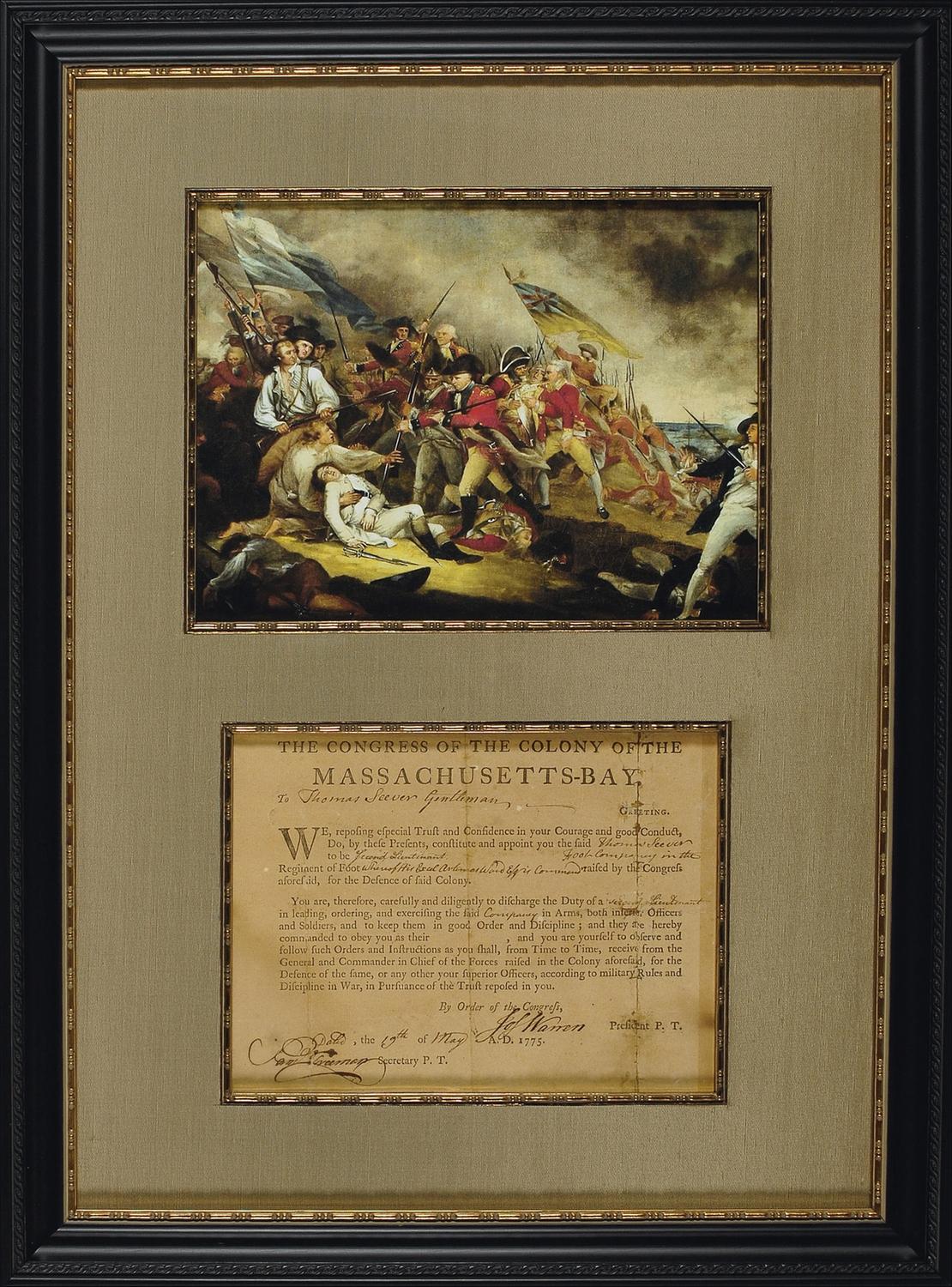 Boston physician, orator and patriot (1741–1775) who was a pivotal figure in the early revolutionary agitation in Massachusetts. Warren drafted the Suffolk Resolves, was active at town meetings during the British occupation, and served on the Committee of Safety after the 1770 Boston Massacre. A member of the first three Provincial Congresses, he was president pro tempore in 1775, and then president. Warren dispatched Paul Revere and William Dawes on horseback to warn the patriots that British General Gage was sending troops to seize stockpiled patriot arms at Concord. Exceedingly rare partly-printed DS, signed “Jos. Warren,” one page, 10 x 7, May 19, 1775. Document signed as president pro tempore of "The Congress of the Colony of the Massachusetts-Bay.” Appointment of Thomas Seever to be "Second Lieutenant Foot Company in the Regiment of Foot Whereof His Eccel Artemas Ward Esqr is Command'r raised by the Congress aforesaid, for the Defence of said Colony. You are, therefore, carefully and diligently to discharge the Duty of a Second Lieutenant in leading, ordering, and exercising the said Company in Arms; both interior Officers and Soldiers, and to keep them in good Order and Discipline; and they are hereby commanded to obey you…and you are yourself to observe and follow such Orders and Instructions as you shall, from Time to Time, receive from the General and Commander in Chief of the Forces raised in the Colony aforesaid, for the Defense of the fame, or any other your Superior Officers, according to military Rules and Discipline of War, in Pursuance to the Trust reposed in you.” Signed at the conclusion by Warren, and countersigned by Samuel Freeman as Secretary Pro Tempore. Beautifully archivally cloth matted and framed with a color image of John Trumbull’s portrait entitled The Death of General Warren at the Battle of Bunker's Hill, June 17,1775, to an overall size of 18 x 24. Affixed to an identical size thin rigid board, repaired vertical separation to right side, intersecting folds, uniform toning from previous display, a bit heavier at edges, otherwise very good condition.