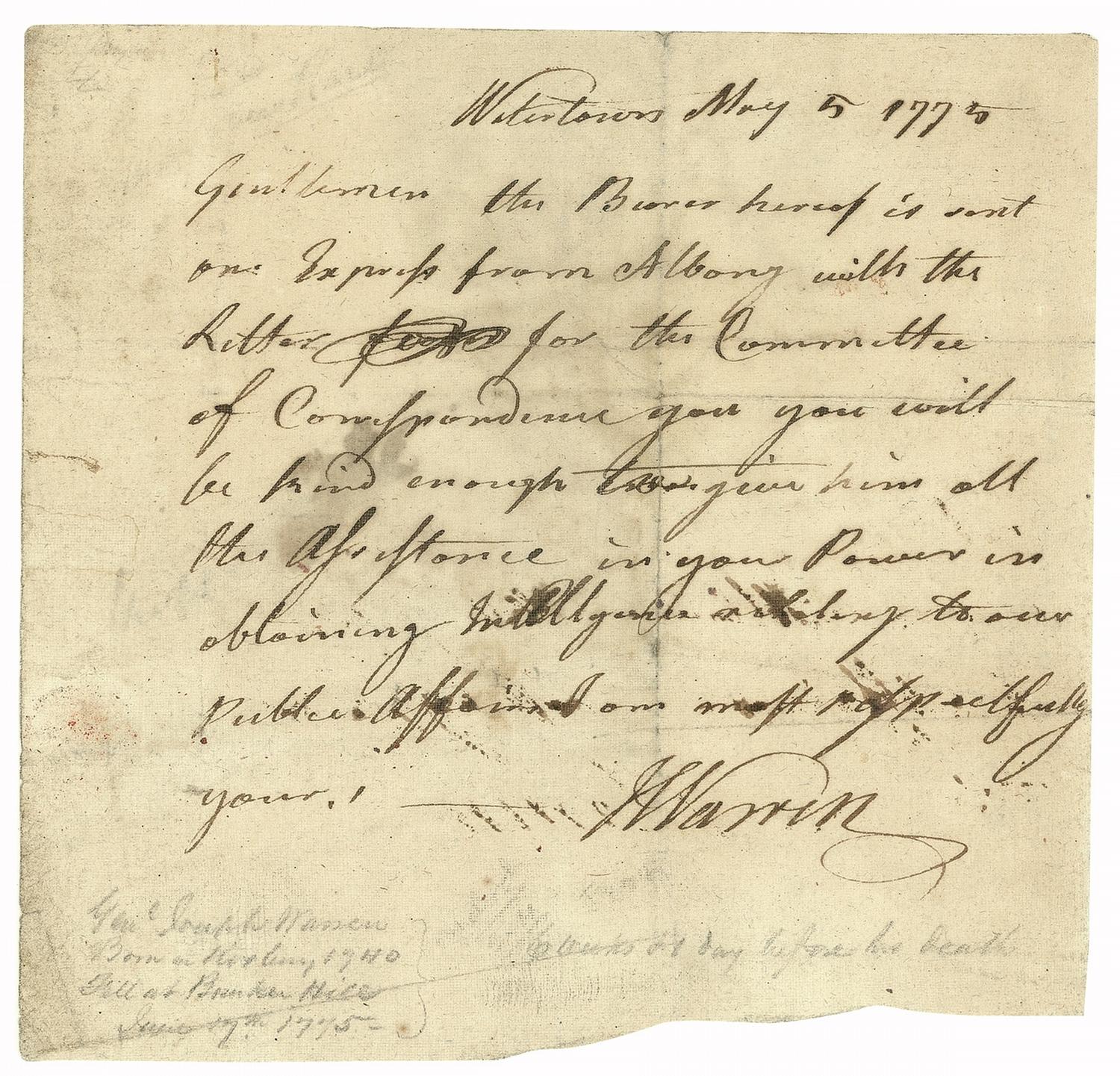 Boston physician, orator and patriot (1741–1775) who was a pivotal figure in the early revolutionary agitation in Massachusetts. Warren drafted the Suffolk Resolves, was active at town meetings during the British occupation, and served on the Committee of Safety after the 1770 Boston Massacre. A member of the first three Provincial Congresses, he was president pro tempore in 1775 (at the time of this appointment), and then president. It was Warren who dispatched Paul Revere and William Dawes on horseback to warn the patriots that the British were sending troops to seize stockpiled patriot arms. A few days after ‘the shot heard round the world,’ Warren left Boston and was later killed at the Battle of Bunker Hill. Historically important and exceedingly rare Revolutionary War-dated ALS signed “J. Warren,” one page, 6.25 x 6, May 5, 1775. Letter reads, in full: “Gentlemen the Bearer hereof is sent on Express from Albany with the Letter for the Committee of Correspondence you you [sic] will be kind enough to give him all the Assistance in your Power in obtaining Intelligence relating to our Public Affairs.” Letter bears collector’s pencilled biographical notes, from 1875, in the lower blank margin and reverse and has been professionally silked. In very good condition, with intersecting folds, one through a single letter of signature, some light mirroring of ink, uneven bottom edge, and scattered light toning and soiling.
