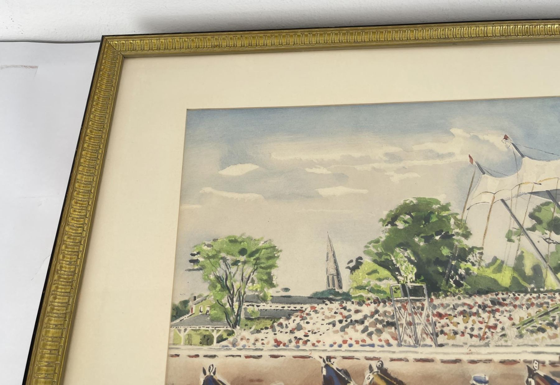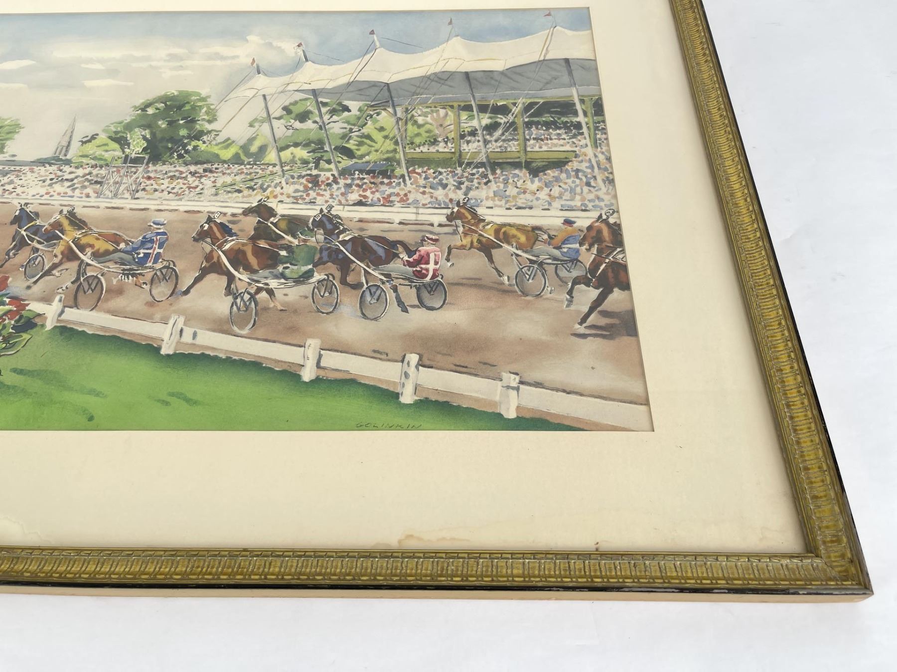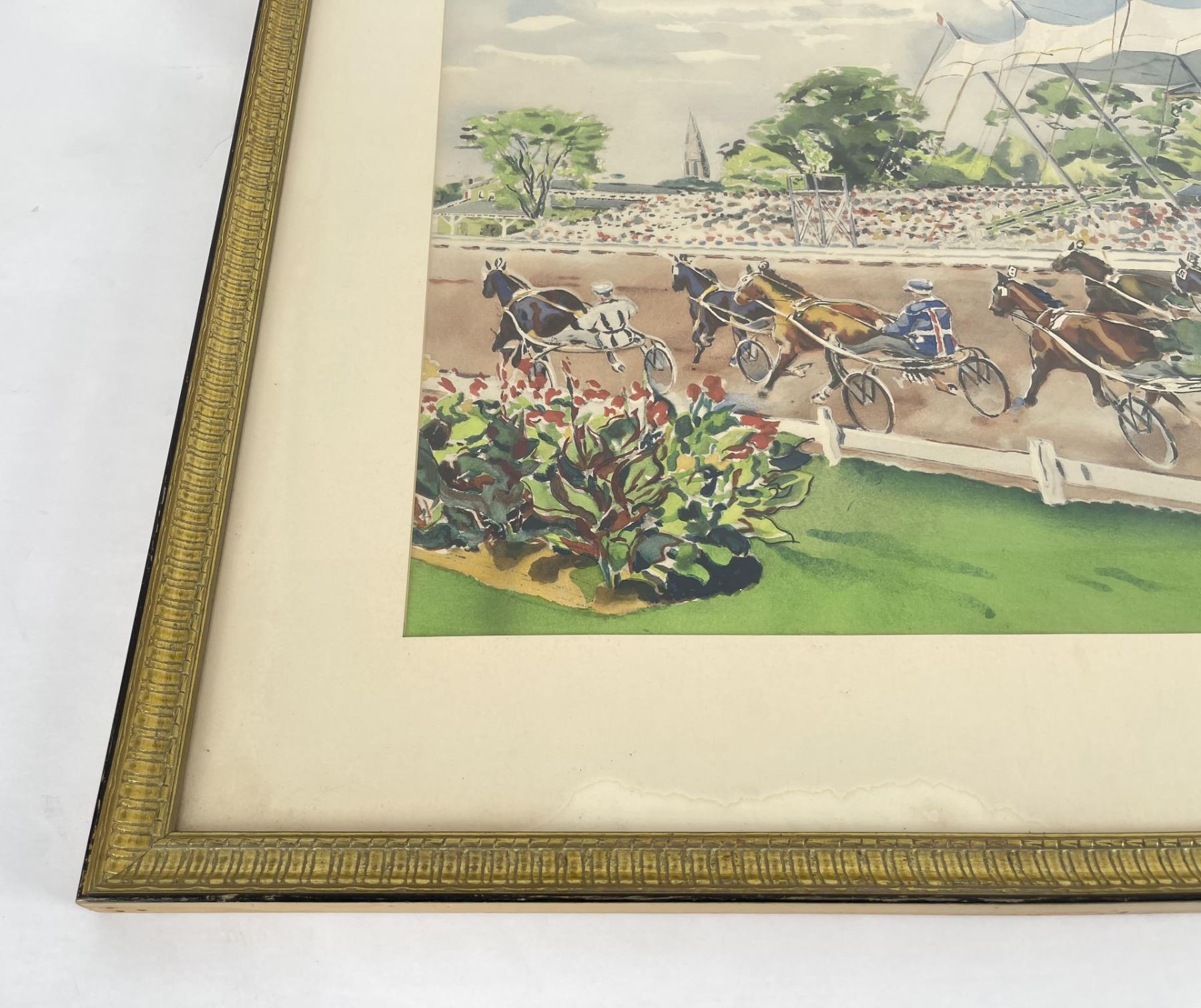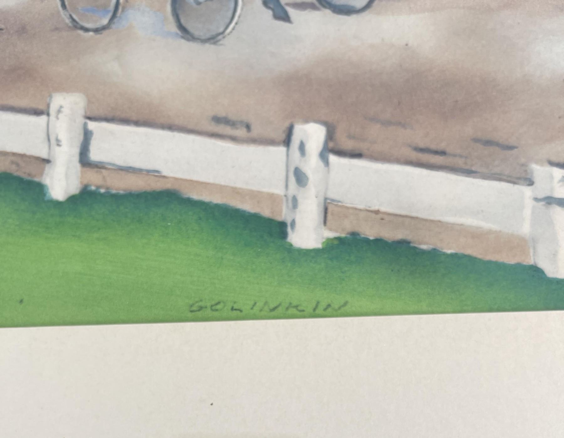 25.5" by 31.5" framed. Born in Chicago, Illinois, Joseph Golinkin, illustrator and fine art painter, was noted for a wide range of subjects that included sports genre, and landscape scenes of South Florida and other places, polo contests, and genre views of New York City. Much of his work reflected American life in the 1920s and 1930 and depicted speakeasies, dance halls, jazz bands, and street scenes with ordinary people going about their business. He also received Gold and Bronze Olympic medals for excellence in art relating to sport. He began his career when newspapers were still using artists as illustrators, and by the mid-1920s, his work had been extensively reproduced in the New York Times, Vanity Fair, Fortune, Country Life, and other publications. After World War I, he went to New York and attended the Art Students League, but he deliberately did not study in Europe because he was committed to having a uniquely American style. He was a student and friend of Social Realist painter George Luks and earned distinction early in his art career. However, from 1939, he served in the Navy for twenty years, becoming a Rear Admiral, and this was a disruption to his art career. After that period and with a strong background in marine activities, he devoted himself to paintings of ocean racing, especially the America's cup, and many of these pictures were reproduced in the book, Twelve Meter Challenges for the America's Cup, published in 1977 with Norris Hoyt. Golinkin's work celebrates man, particularly man in action, and his polo works depicting the great history of polo at Meadow Brook in the 1930's offers an excellent extraordinary collection, which includes 35 handcolored lithographs, 29 black and white lighographs and 20 watercolors. The works depict the great players of the 1930's---Guest, Hitchcock, Pedley, Balding, Roark, Guinness, Lacey and fieldside views of the 1930 Westchester Cup, the 1930 International Cup at Meadow Brook and the 1938 US Open Finals.