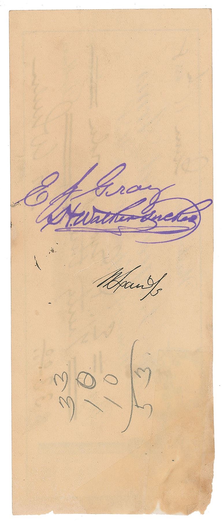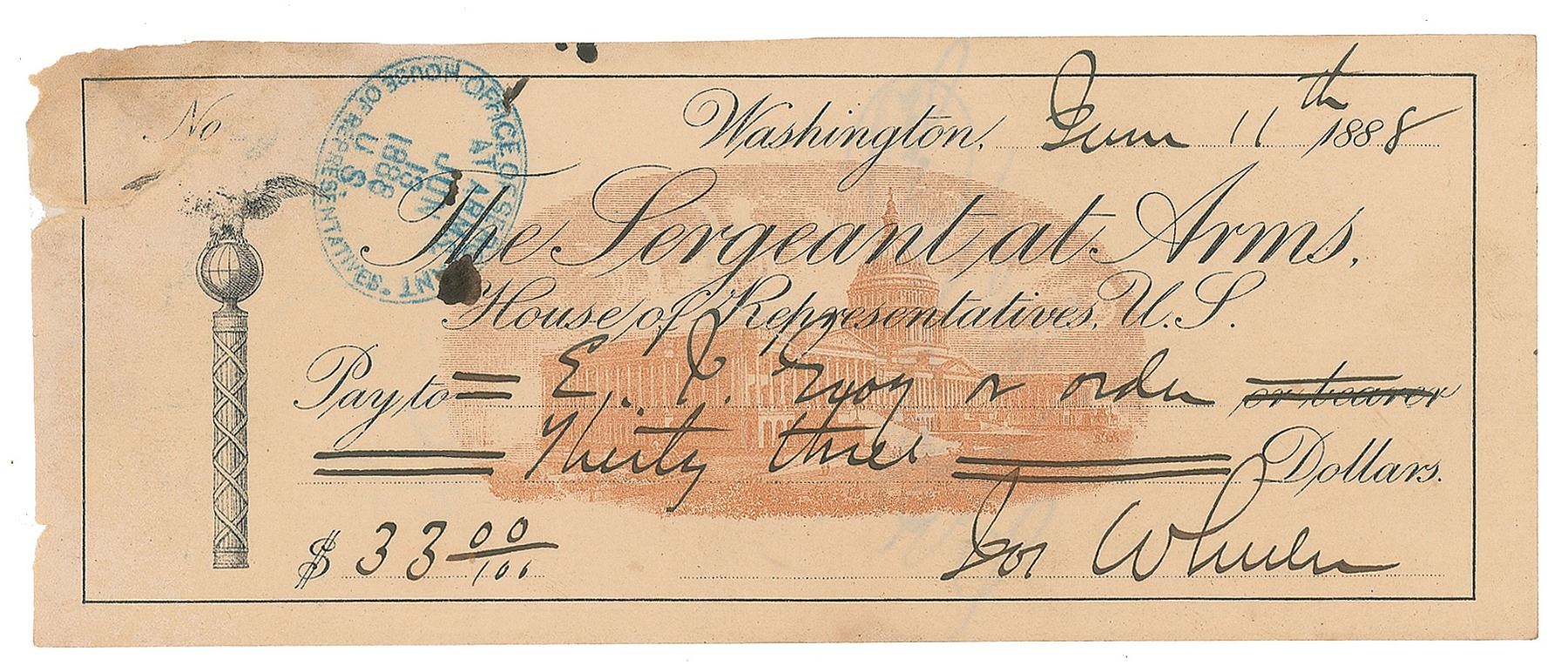 The Sergeant at Arms, House of Representatives check, 7.5 x 3, filled out and signed by Joseph Wheeler, "Jos. Wheeler," payable to E. J. Gray or order for $33, June 11, 1888. In very good to fine condition, with a tear to the upper left corner repaired with tape on the back.