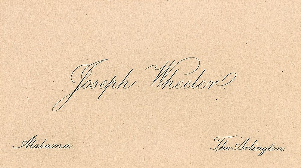 Original personal calling card bearing Wheeler’s name and Alabama address, 3.25 x 1.75, boldly signed on the reverse in black ink, “Jos. Wheeler, Major Gen.” In fine condition.