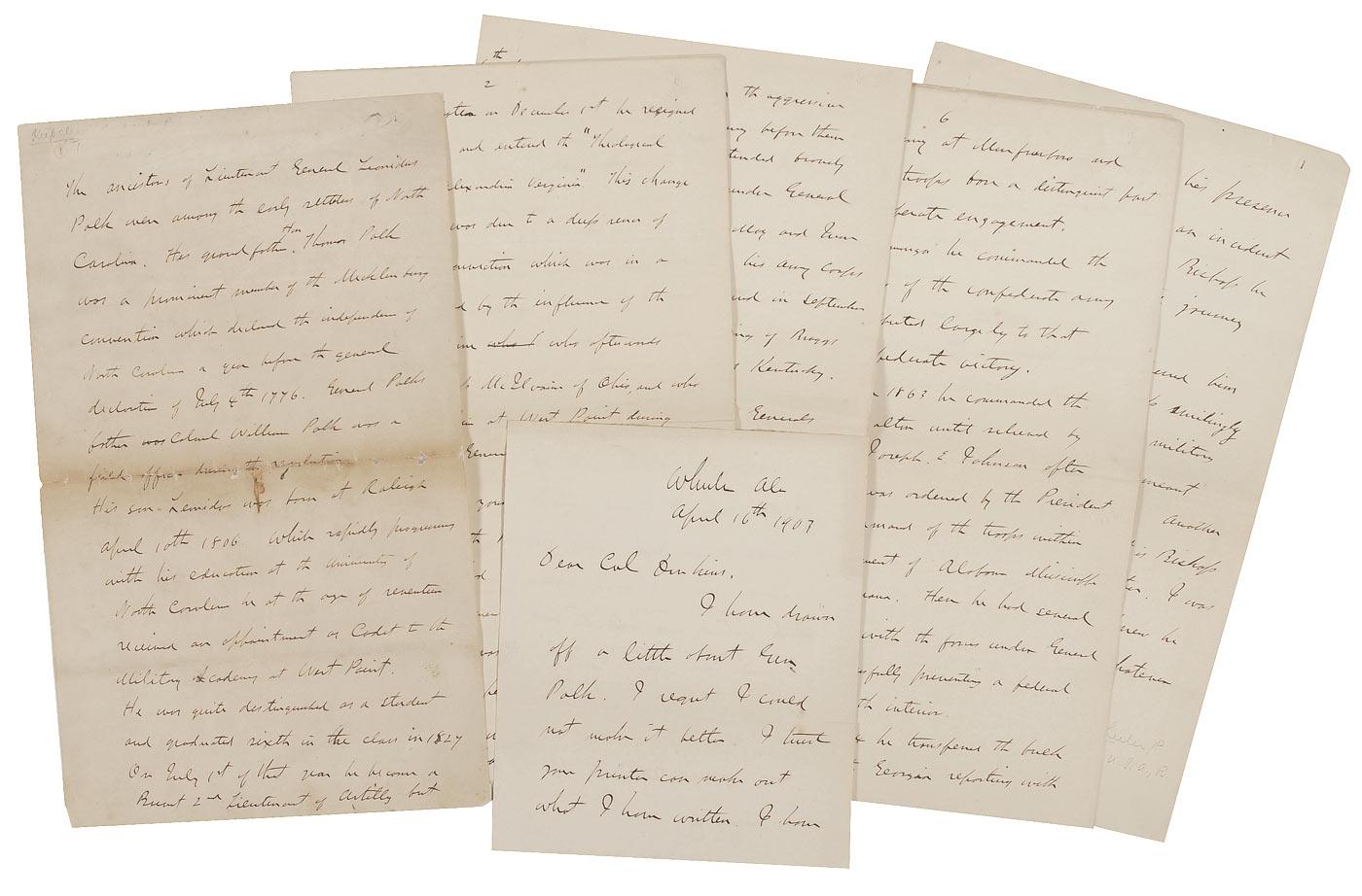 Confederate major general (1836–1906), known as “Fightin’ Joe,” who led his troops in vigorous opposition to Sherman during the Atlanta campaign. Two items: ALS, signed “Joseph Wheeler,” one page, 7 x 8.5, April 16, 1903. Letter of response to Col. James Dunkins. In part, “I will start at work & do best I can on sketch of Gen. Polk. How many words would you recommend.”; and an unsigned eight page handwritten manuscript, 8.5 x 15, no date. Manuscript reads, in small part, “On November 7 his troops crossed the Mississippi river and fought the battle of Belmont Missouri, the opposing force being commanded by General U. S. Grant. The advance of the federal forces from Paducah compelled the retirement of Gen. Polk’s troops from Columbus…At the battle of Shiloh Gen. Polk commanded the First Army Corps.” In very good condition, with scattered light toning and soiling, and tape reinforcement to horizontal folds of manuscript.