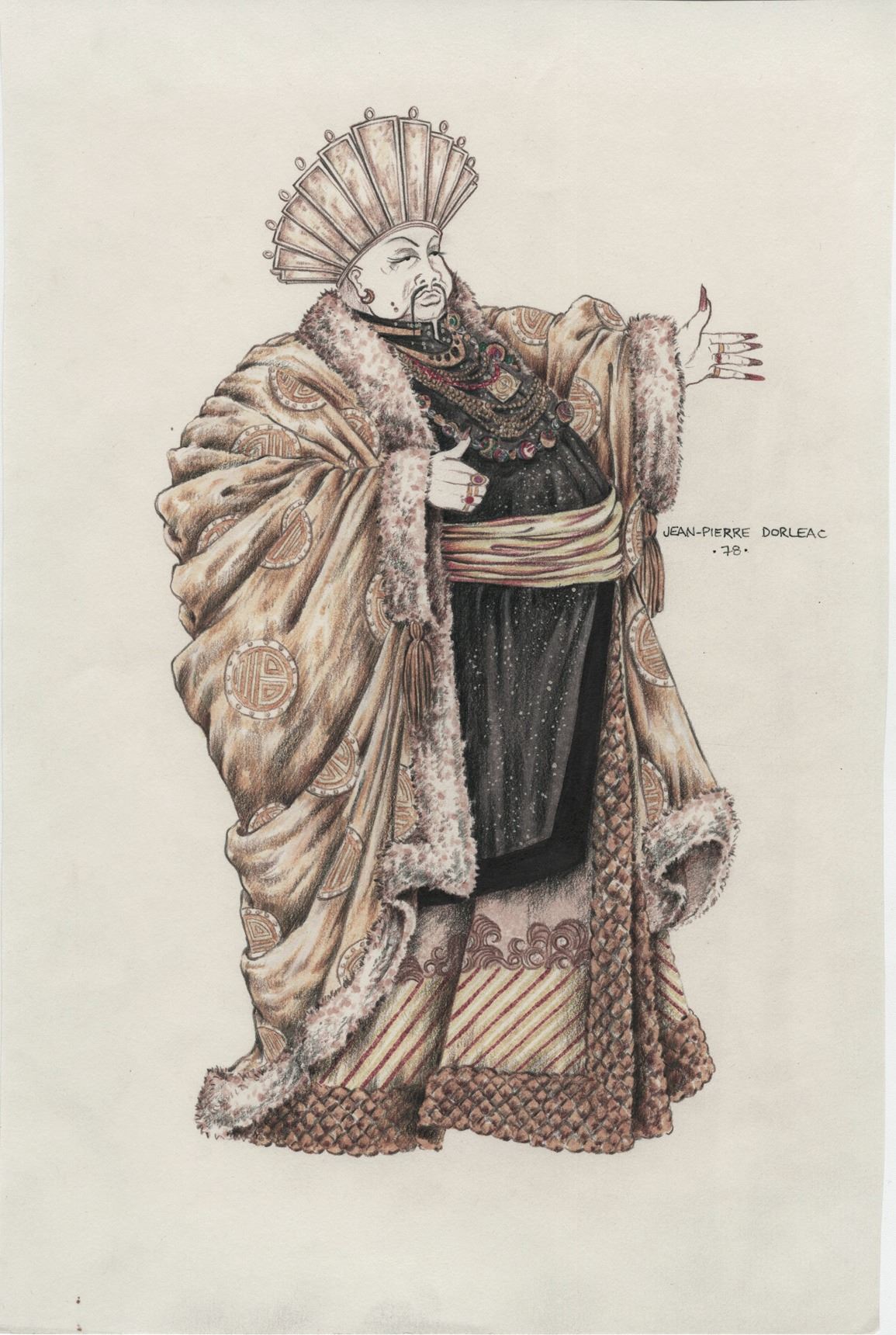 175. Joseph Wiseman "King Draco" costume sketch by Jean-Pierre Dorleac for Buck Rogers in the 25th Century.(1979) Vintage original sketch accomplished in artists pencils and gouache on 9 x 13.75 in. artists leaf. Exhibiting mildly uneven trimming to sides. Signed by the artist to the right of artwork. In vintage very fine condition. This lot is from the estate of Dwight Richard Odle (1941-2018). Proceeds will go to the St. Jude's Memorial Foundation. $200 - $300