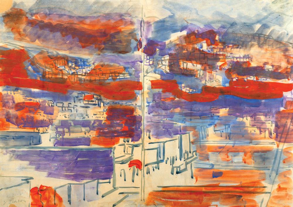 Joseph Zaritzky, Israeli Art, 1891 - 1985, Tel Aviv, Pole on the Rooftops, Watercolor, 48x68cm, Signed., , , , ,