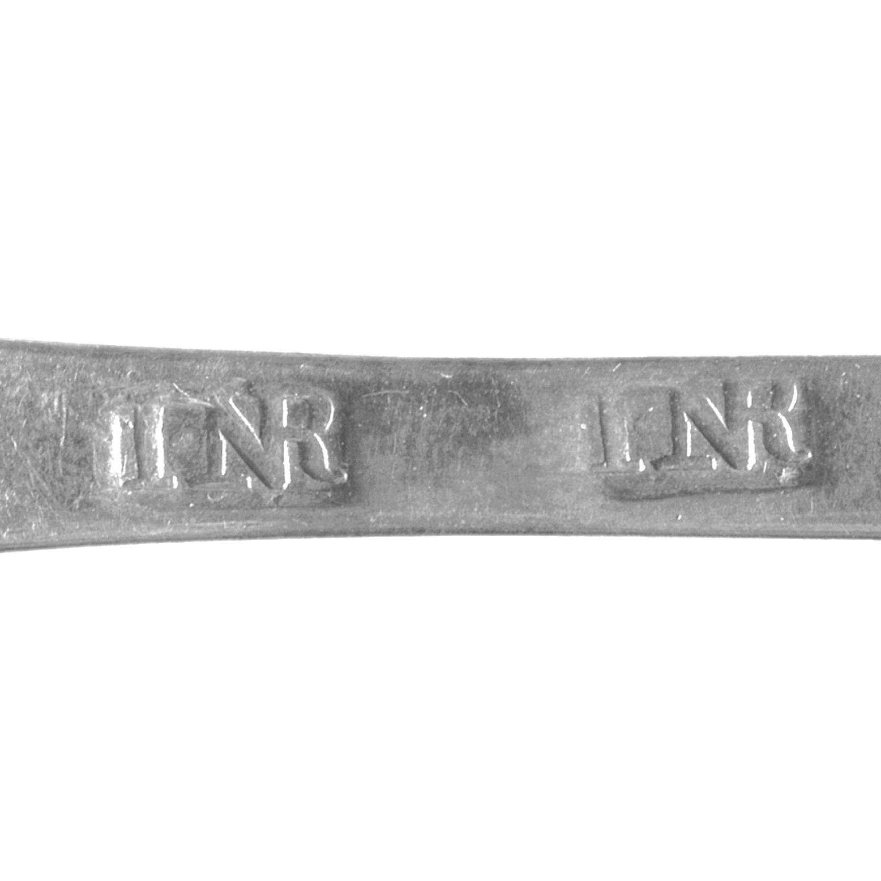 Stamped with maker’s Hallmark Twice on the back of the stem with his “I.NR” Rectangular Hallmark Punch. This Dinner Spoon is of an old English bright-cut ornamentation pattern with a elongated rounded drop. It is ridged and channeled for ornamentation on back of the handle and the initials are engraved upon the top portion of the handle.