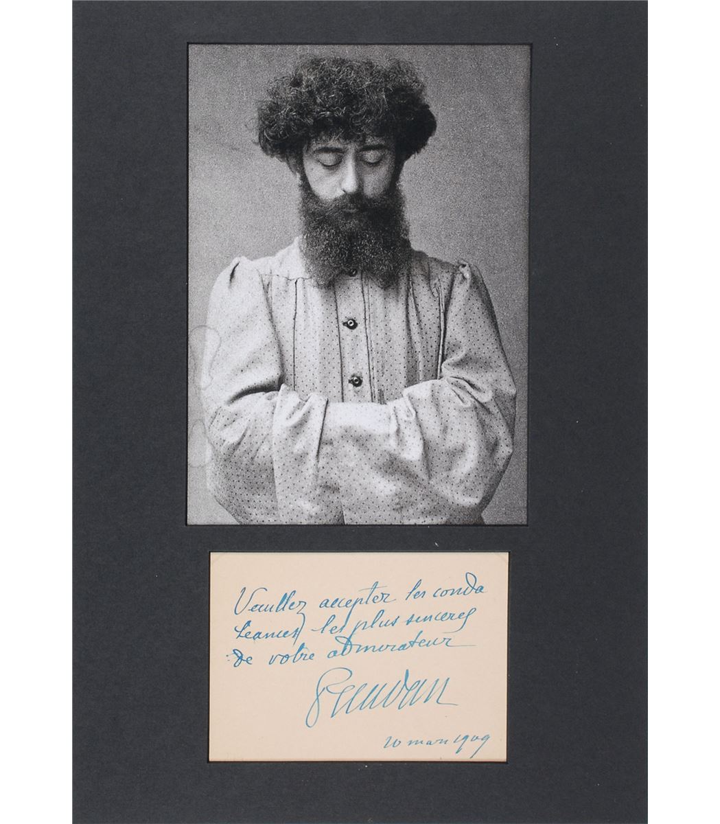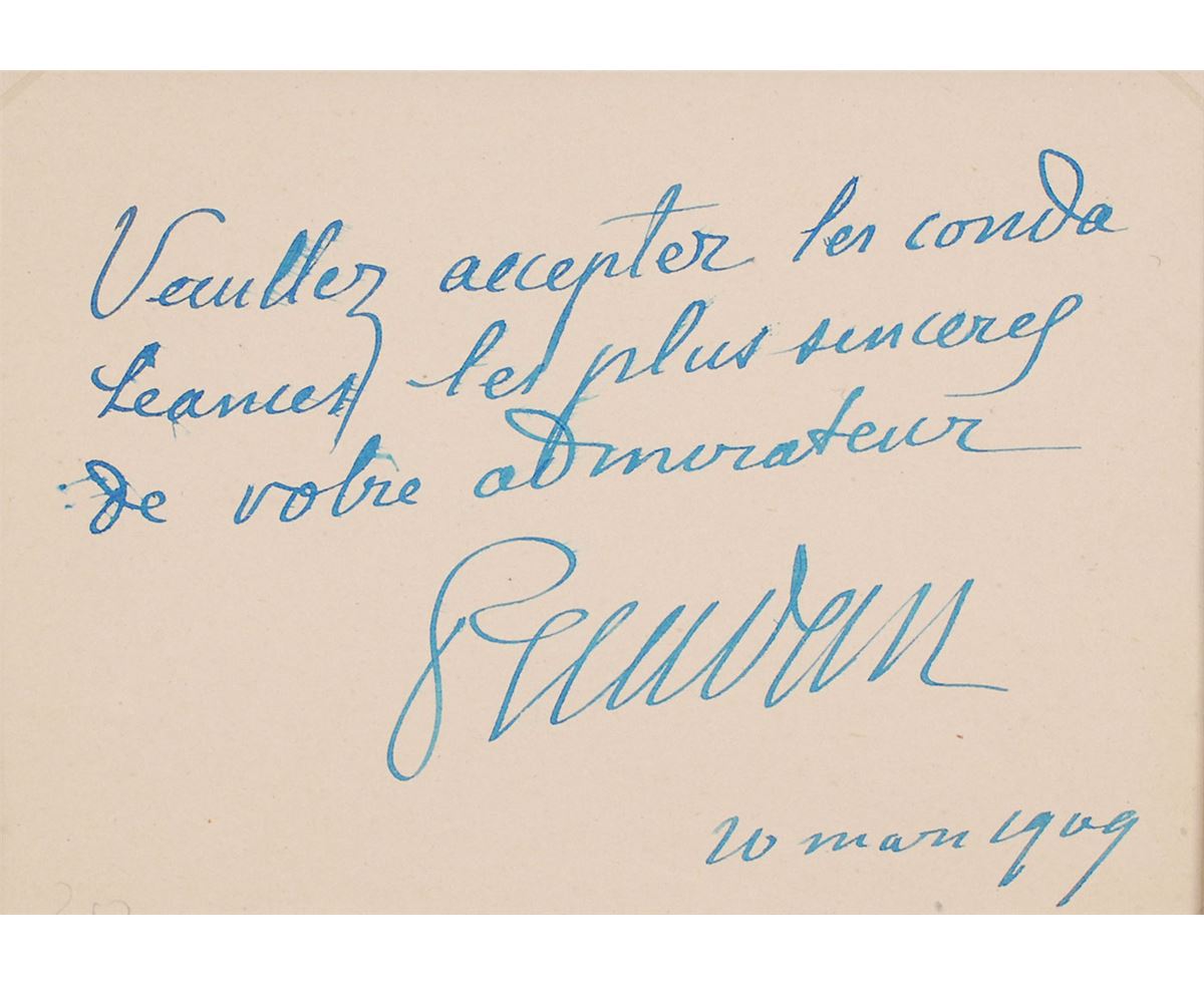French novelist and Martinist (1858–1918) interested in spirituality and mysticism. ANS in French, signed “Peladan,” one page, 4.25 x 3, March 20, 1909. In full (translated): "Please accept the condolences of your admirer.” Matted with an image of the writer to an overall size of 8.25 x 11.75. In fine condition.