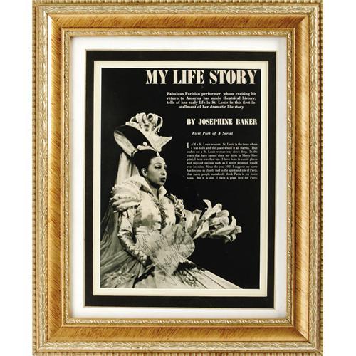 <B>Josephine Baker Autograph.</B></I> The first page of the first installment of Joesphine Baker's serialized autobiography, inscribed and signed by her in black ink. In Very Fine to Excellent condition with very mild tanning, nicely matted and framed to an overall size of 13" x 16".<BR><BR><b>Shipping:</b> Framed - with Glass, Small (<a target="_blank" href="http://www.heritageauctions.com/common/shipping.php">view shipping information</a>) <BR><BR><B>Important notic