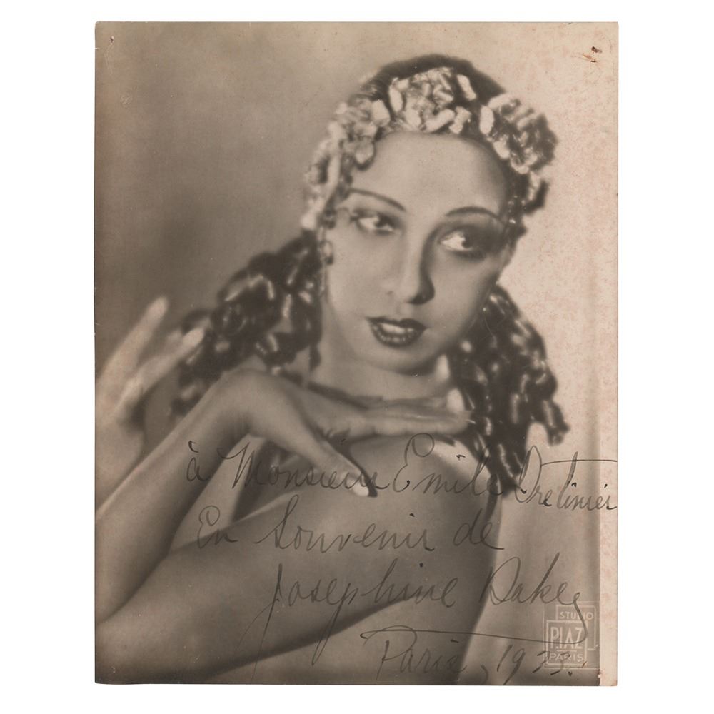 Vintage glossy 6.5 x 8.5 photo of the lovely entertainer by Studio Piaz of Paris, signed and inscribed in fountain pen, "A Monsieur Emile Dretinier, en souvenir de Josephine Baker, Paris, 1933.” In very good to fine condition, with trimmed edges, tack holes to the corners, light silvering, and mottled foxing.