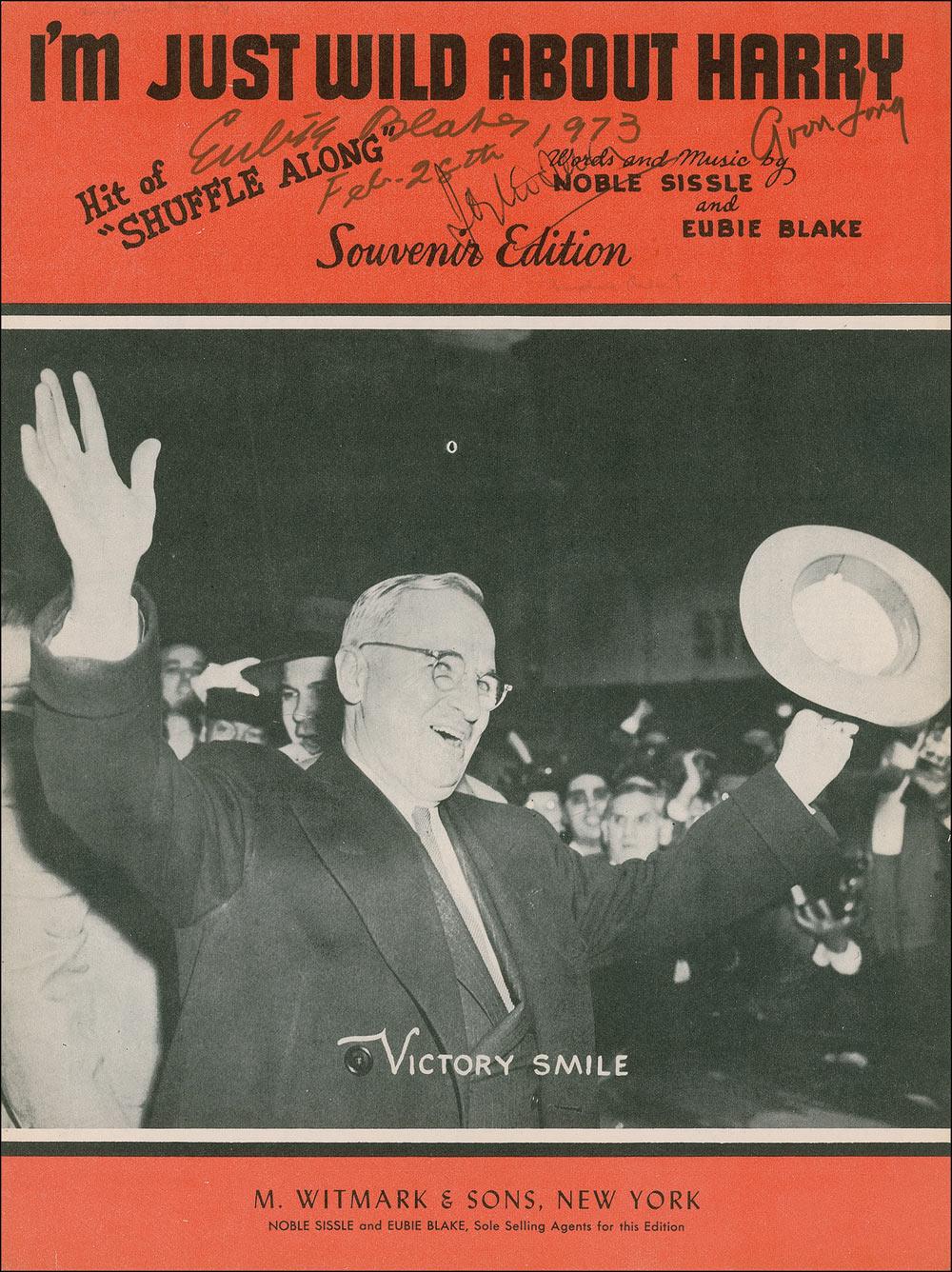 Sheet music from ‘I’m Just Wild Harry,’ 9 x 12, six pages, signed in black felt tip by Josephine Baker and Eubie Blake (adding “Feb. 28th 1973, Good Song”). In fine condition.