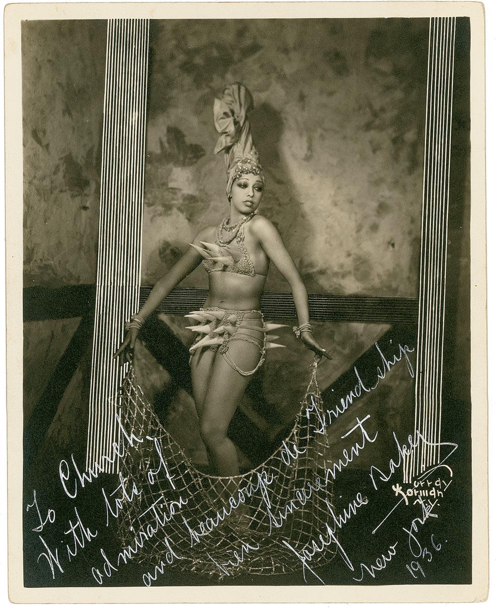 African-American expatriate singer and dancer (1906–1975), nicknamed the “Black Venus,” who became one of the greatest sensations of Jazz-Age Paris. Incredible vintage matte-finish 8 x 10 full-length photo of Baker in a risque two-piece costume adorned with spikes, signed and inscribed in white ink “To Church, With lots of admiration and beaucoup de friendship, bien sincerement, Josephine Baker, New York, 1936.” In fine condition. Surely a shocking image for its time!