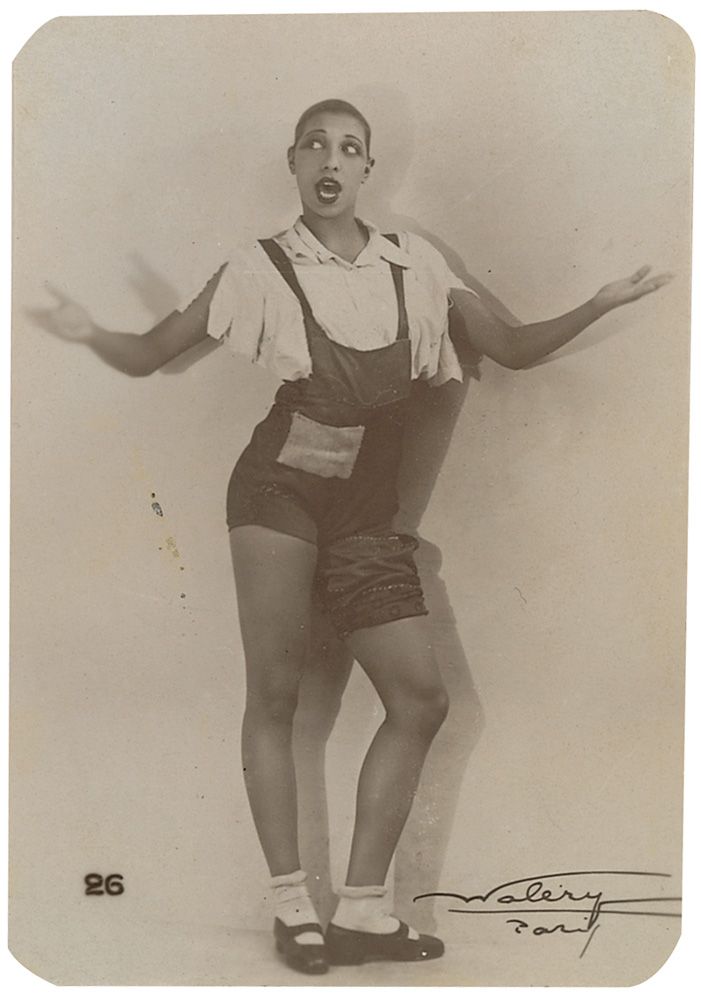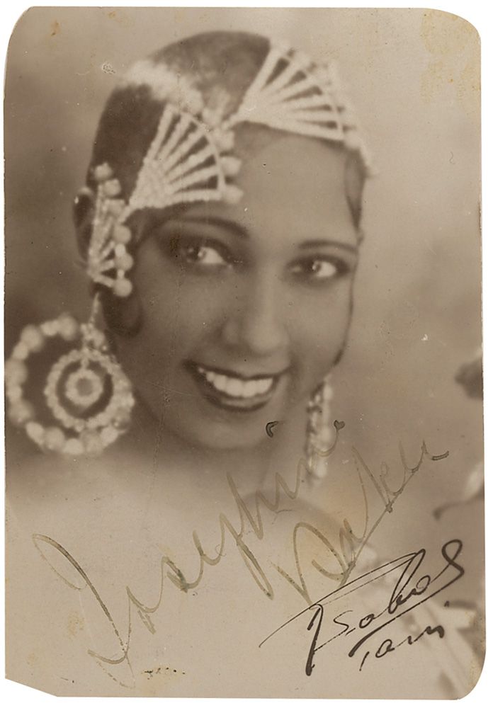 Gorgeous vintage pearl-finish 2.25 x 3.25 photo of Baker in a jeweled headpiece, by Isabel of Paris, signed in fountain pen. Light scattered soiling, trimmed edges with clipped corners, and the signature a shade light, otherwise fine condition. Accompanied by an unsigned photo of Baker by Walery of Paris.