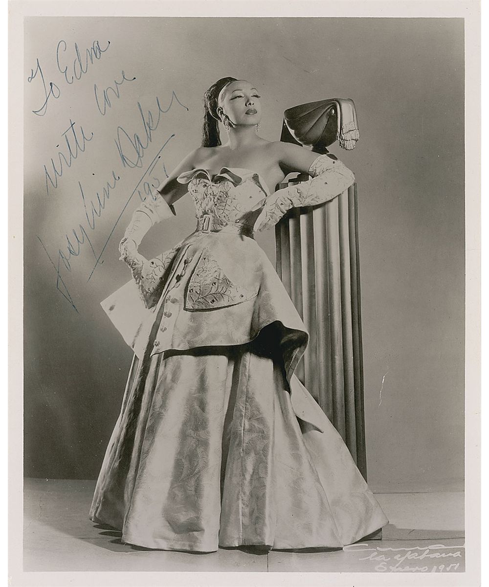 Stately vintage glossy 8 x 10 full-length photo of Baker in an elegant dress, signed and inscribed in fountain pen, “To Edna, with love, Josephine Baker 1951.” In very good condition, with scattered creases (heavier to the lower right) and a slightly trimmed right edge.
