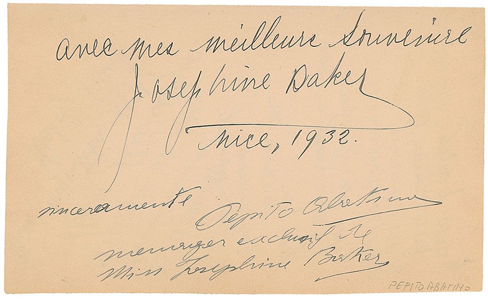 Vintage fountain pen signature, “Avec mes meilleurs souveniere, Jospehine Baker, Nice, 1932,” on an off-white 7 x 4.25 sheet, also signed by her manager, and reported lover, Pepito Abatino. In fine condition.