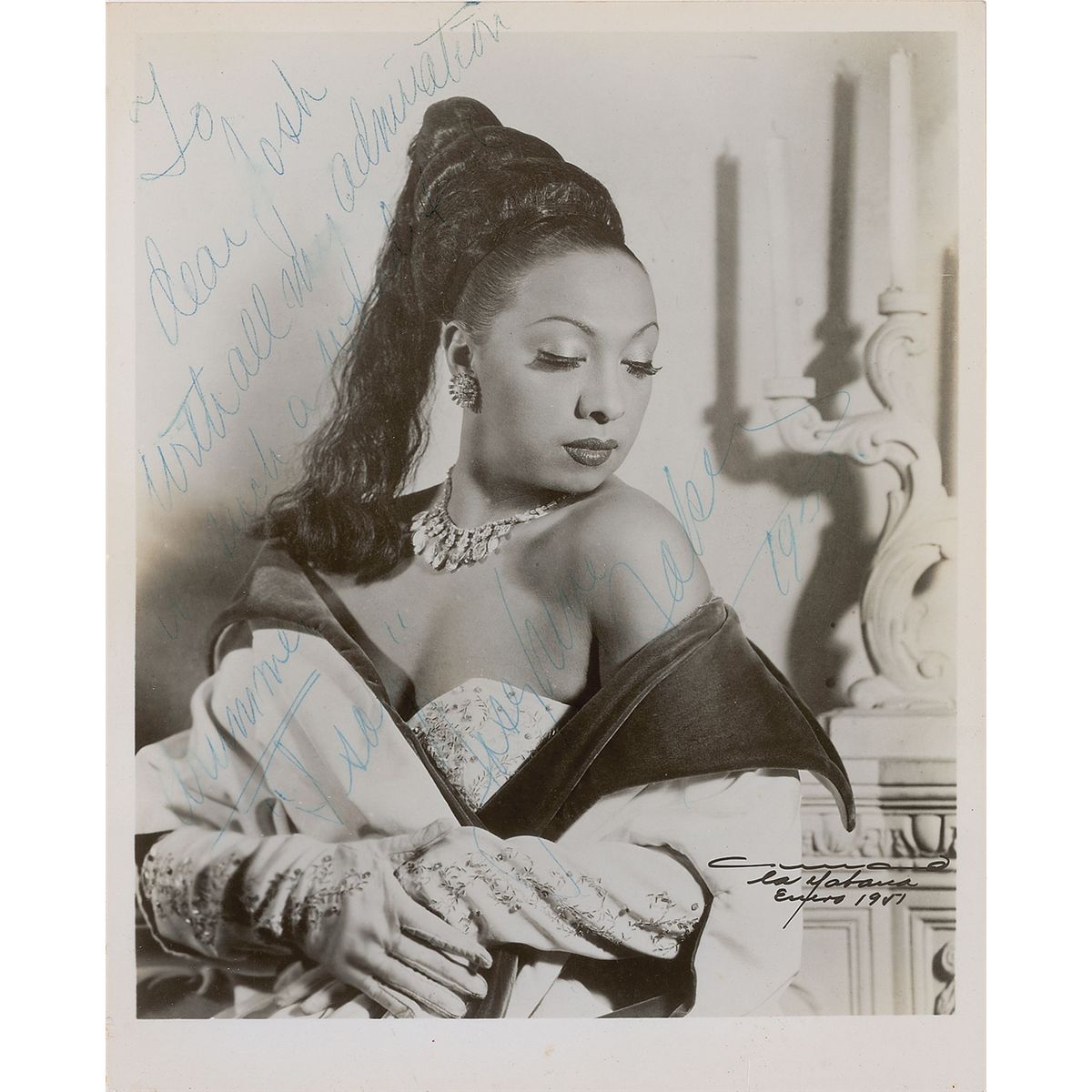 Attractive vintage glossy 8 x 10 photo of Baker in a dazzling outfit, signed and inscribed in blue ballpoint, “To dear Josh, with all my admiration to such a wonderful drummer, ‘I Say,’ Josephine Baker, 1952.” Some brushing to areas of the inscription and moderate contrast to signature against the busy background, otherwise fine condition. The recipient of this photo was drummer Josh Gerber, husband of jazz vocalist Teddi King.