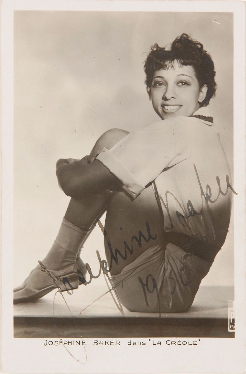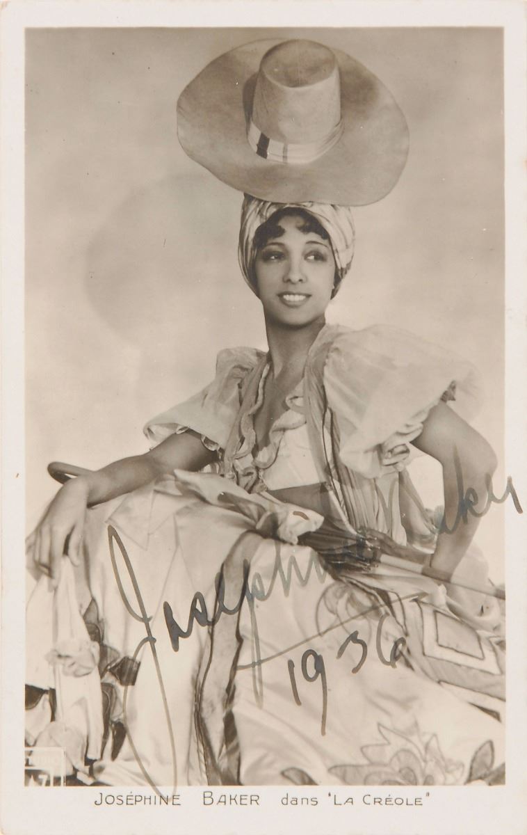 Pair of vintage glossy 3.5 x 5.5 postcard photos of Baker in ‘La Creole,’ each signed in fountain pen, “Josephine Baker, 1936.” Both are individually mounted and matted to overall sizes of 14 x 17. In overall fine condition.