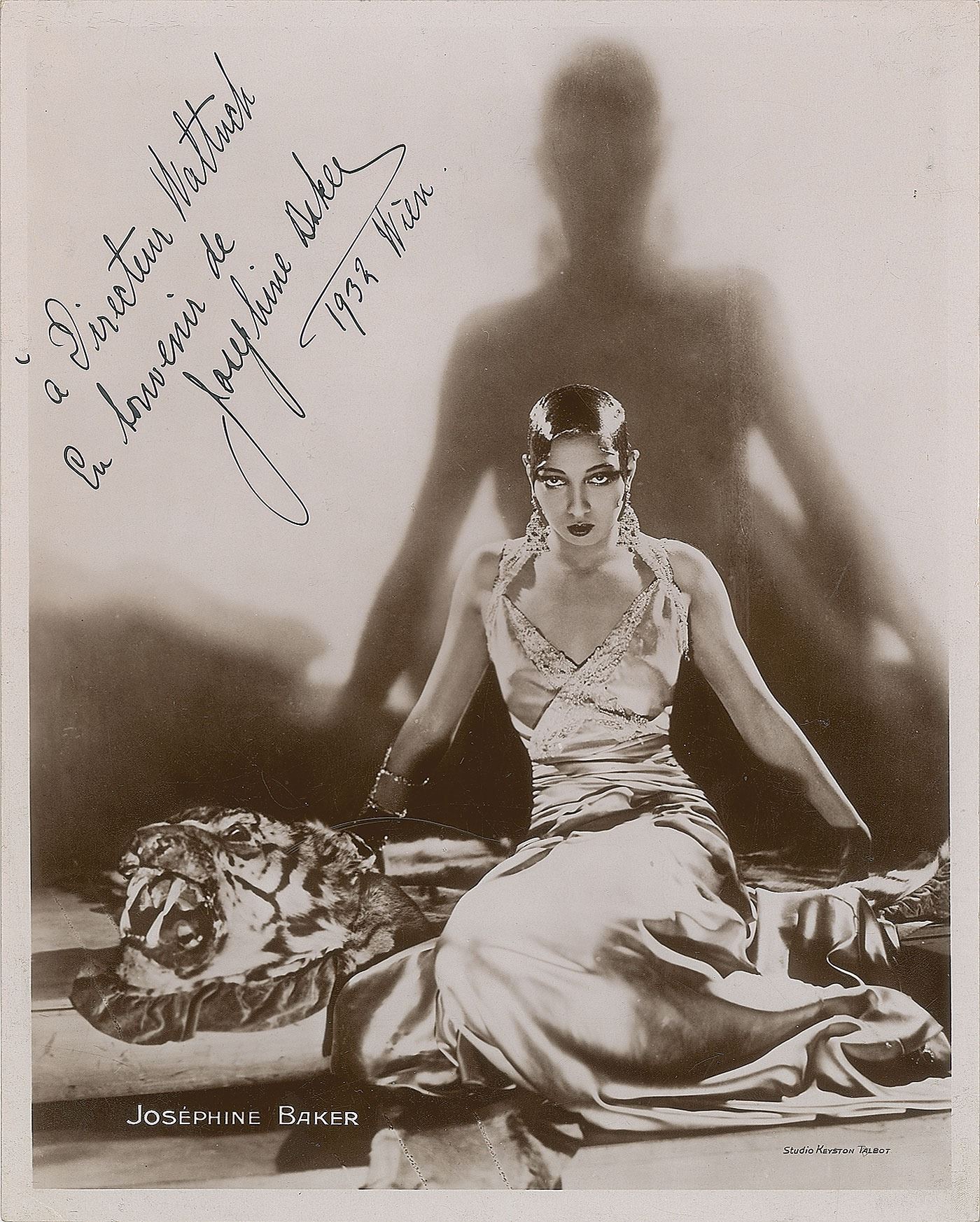 Beautiful vintage glossy 9 x 11.5 portrait of Baker lounging on a tiger skin rug and wearing a gorgeous gown, by Studio Keyston Talbot, prominently signed and inscribed in fountain pen, "A Directeur Waltuch, en souvenir de Josephine Baker, 1932 Wien.” In fine condition. Baker is rare in signed photographs of this size—a truly spectacular example.