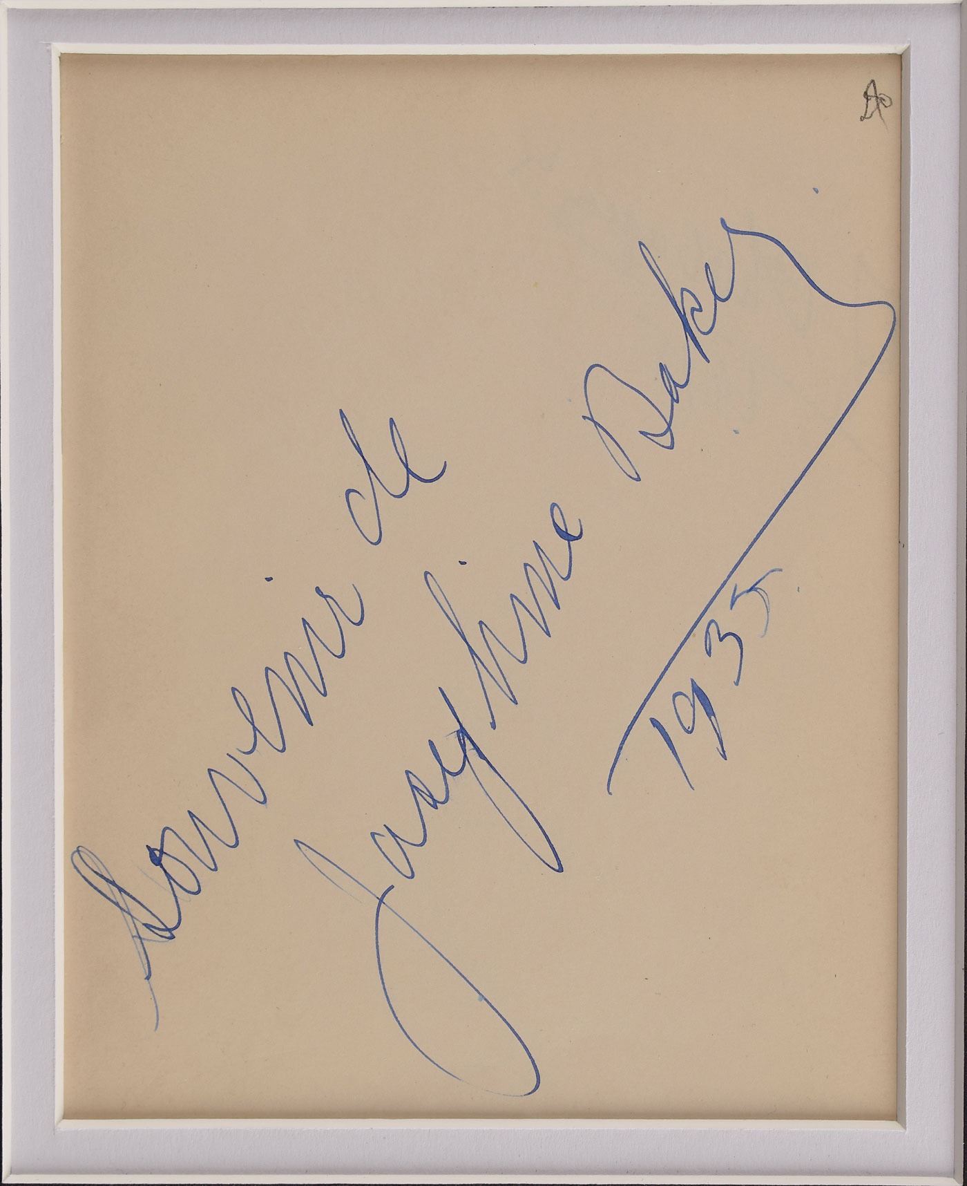 Large vintage fountain pen signature, "Souvenir de Josephine Baker, 1935,” on a 4.5 x 6 album page. Double-matted with an exotic portrait to an overall size of 8.75 x 18.75. In fine condition.