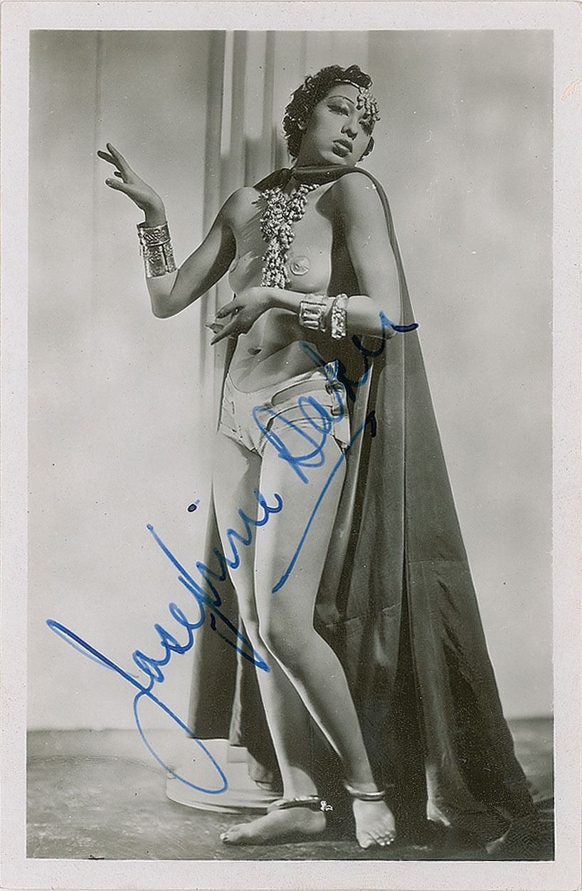 Exotic vintage glossy 3.5 x 5.5 postcard photo of Baker in a revealing costume, prominently signed in fountain pen. In fine condition.