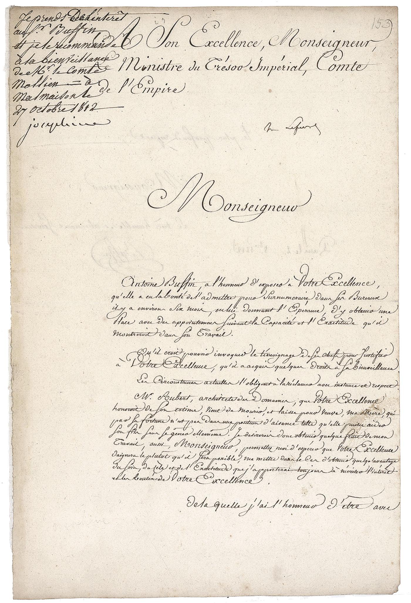Empress of France, born Joséphine de Beauharnais (1763–1814). Married Napolean in 1796 and divorced in 1810, unable to produce an heir. Endorsement in French, signed “Josephine,” in the top left corner of a one page manuscript document, in French, 8 x 12, October 27, 1812. A petition submitted by Antoine Buffin to Comte Francois Mollien, Napoleon’s Minister of Finance, seeking assistance. Josephine endorses the petitioner and personally requests Mollien to assist him. In very good condition, with slight mounting remnants along reverse left edge, light intersecting folds, scattered light creases, and a bit of mild edge toning and soiling, otherwise fine condition. A nicely preserved document from one of history’s most intriguing women!.
