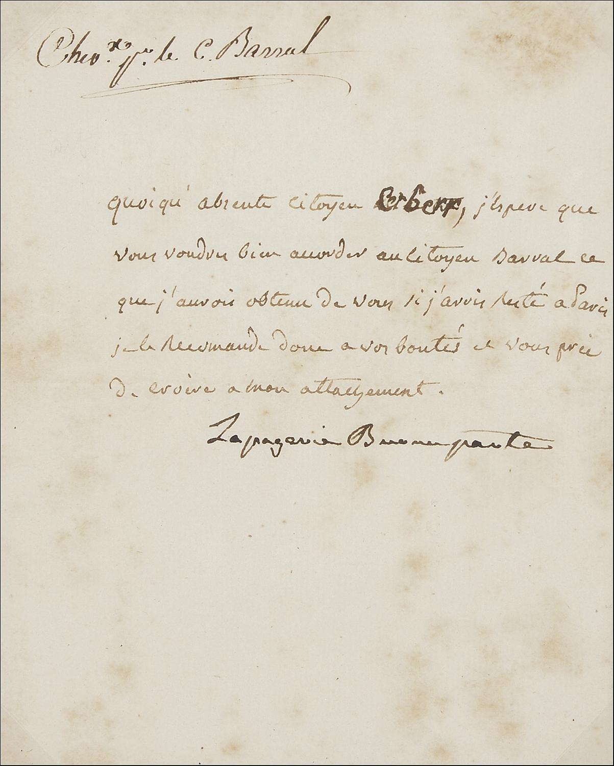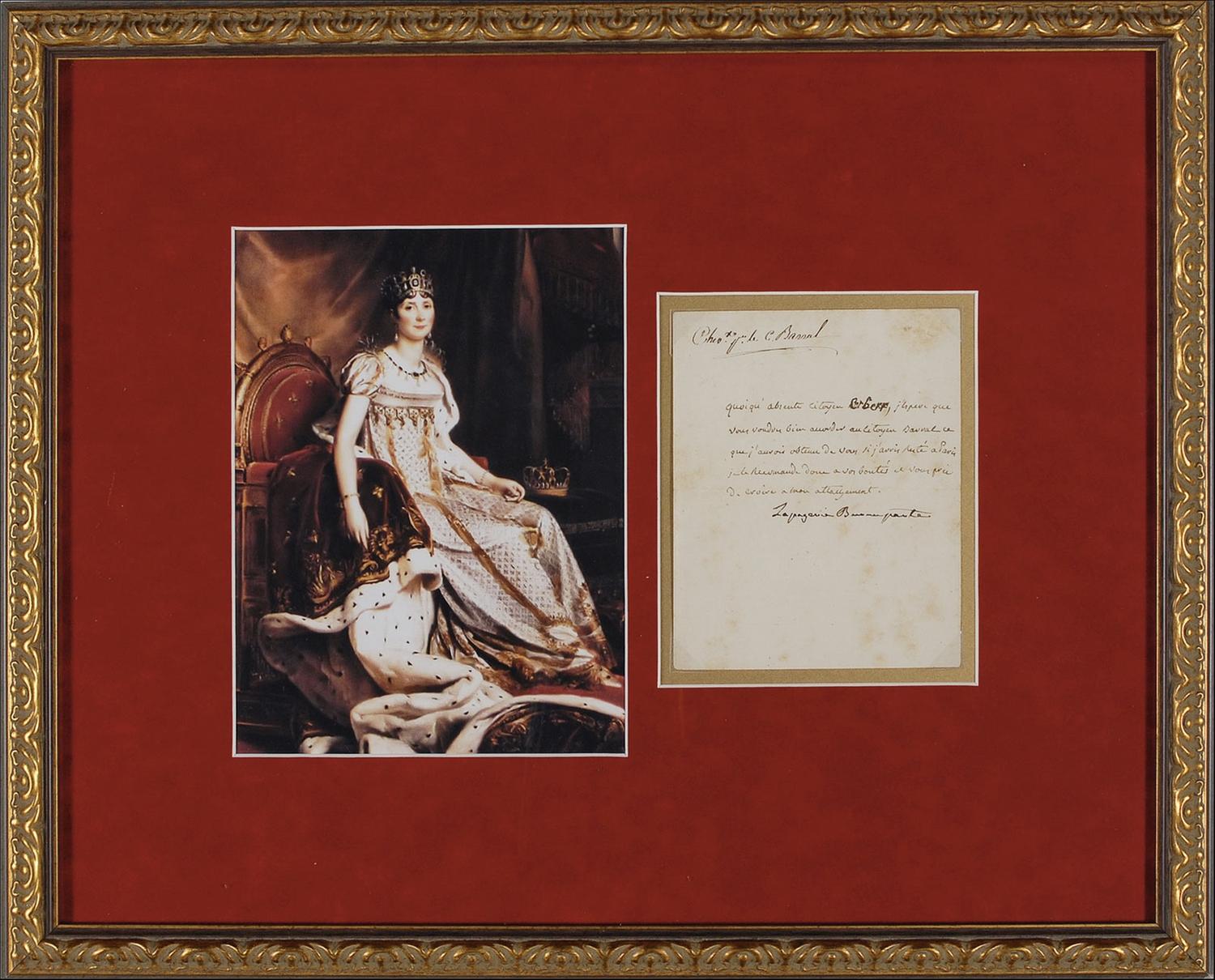 Empress of France, born Joséphine de Beauharnais (1763–1814). Married Napoleon in 1796 and divorced in 1810, unable to produce an heir. LS in French, signed “La Pagerie Bonaparte,” one page, 5 x 6.25, no date. A letter most likely concerning a transfer of horses. In full (translated): “Citizen Cerberr, although absent, I hope that you will want to grant citizen Barral what I would have obtained from you if I had stayed in Paris. I therefore recommend him to your kindness and please believe in my affection.” Matted and framed with a photo to an overall size of 21.75 x 17.75. In very good condition, with scattered staining and soiling (lightly touching signature) and a few wrinkles. The signature is dark and otherwise unaffected. An uncommon letter from one of history’s most intriguing women.