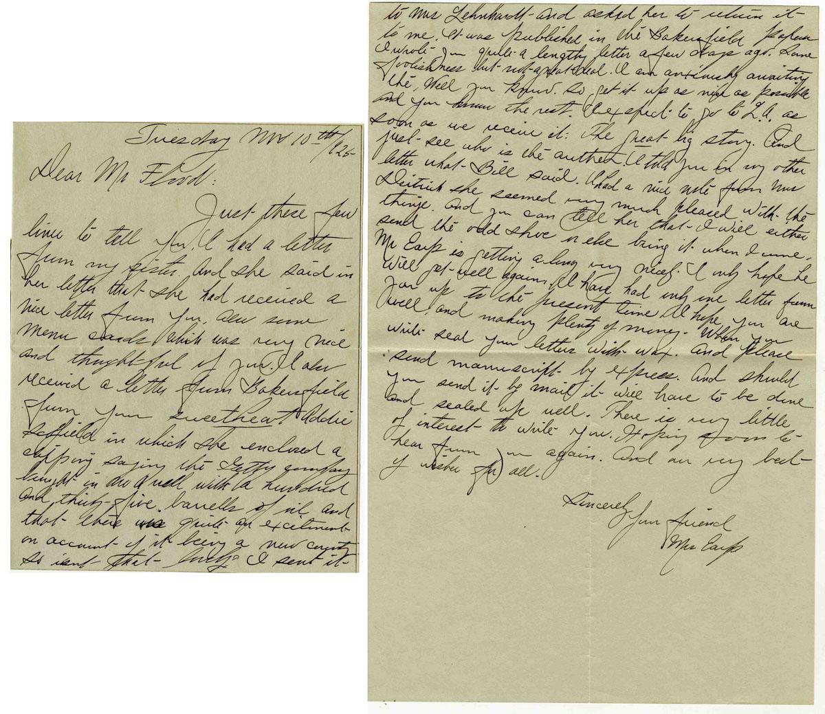 Autograph letter signed by Josie Earp, wife of the famed lawman and gambler Wyatt Earp. Josie writes to mining engineer John H. Flood Jr. on 10 November 1925. Lengthy letter reads in part, ''…I am anxiously awaiting the Will you know. So set it up as nice as possible and you know the rest. I expect to go to L.A. as soon as we receive it…Mr. Earp is getting along very nicely. I only hope he will get well again…I hope you are well and making plenty of money…Mrs. Earp.'' Three pages measuring 6'' x 8'', with original envelope. Very good.