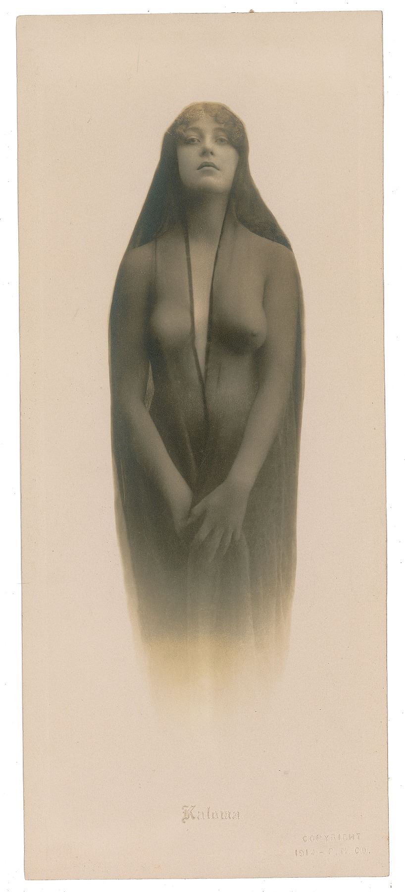 Stunning matte-finish 5 x 12 silver gelatin photo of Wyatt Earp’s wife Josie, showing her dressed in a sheer robe. Blindstamped at the bottom with photographer’s credits, “Kaloma” and “Copyright, 1914—P.N. Co. [Pastime Novelty].” In fine condition, with light silvering to the darker areas of the image.