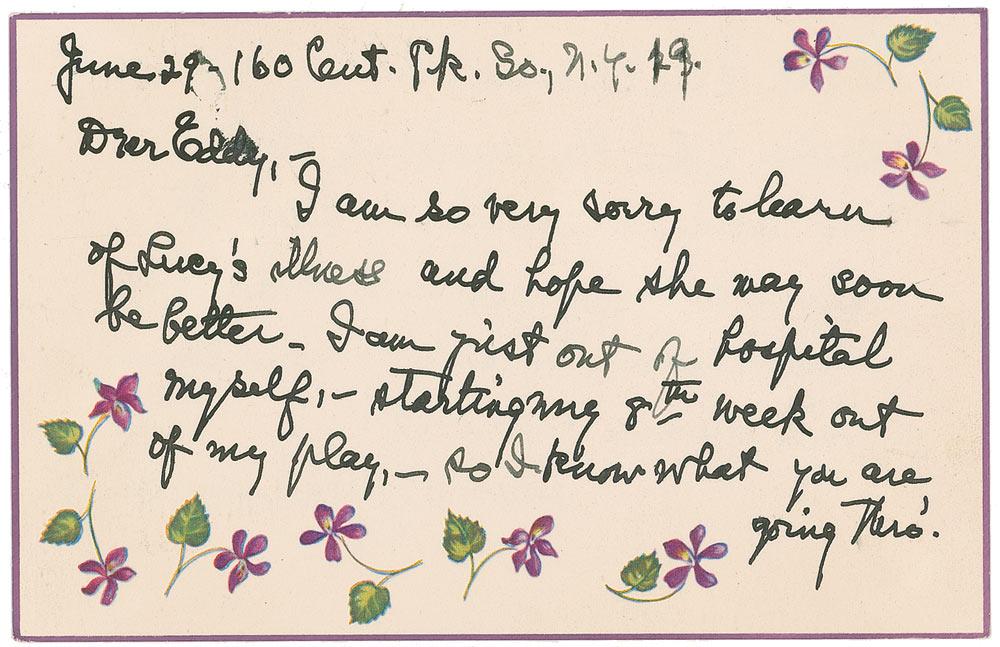 American stage and screen actress (1886–1957) who won the 1950 Academy Award for Best Supporting Actress for her role in Harvey. ALS, one page both sides of a decorative 5.5 x 3.5 postcard, June 29. In part: “I am so very sorry to learn of Lucy’s illness and hope she may soon be better. I am just out of hospital myself—starting 8th week out of my play—so I know what you are going thro’. I wish I could send more of a contribution than the enclosed, but my good wishes are endless.” In fine condition with some light handling wear.
