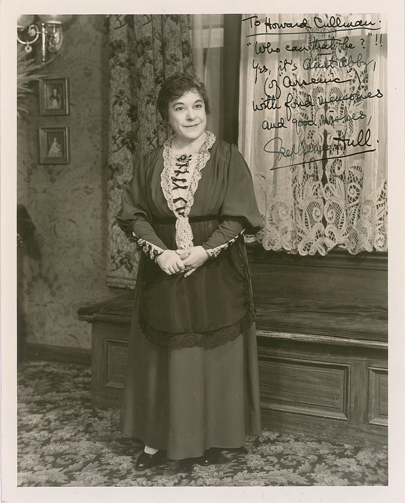 American stage and screen actress (1886–1957) who won the 1950 Academy Award for Best Supporting Actress for her role in Harvey. Scarce vintage matte-finish 8 x 10 Vandamm photo, signed and inscribed in fountain pen “To Howard Cullman, ‘Who can that be?’!! Yes it’s Aunt Abby (of Arsenic) with fond memories and good wishes, Josephine Hull.” In fine condition, with some light corner creases and a few horizontal creases to image.