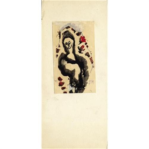 <B>Josephine Mahaffey</B></I> (American 1903-1982)<B><BR></B></I><I>Portrait of a Woman and Child<BR></B></I>Watercolor, acrylic and ink on paper, mounted on mat board<BR>10-1/2 x 5 inches (26.7 x 12.7 cm)<BR>Signed lower right<I> JM<BR></B></I> <BR>Josephine Mahaffey attended the College of Industrial Arts (now Texas Woman's University) and after graduation continued her studies with Sallie Blythe Mummert. Additional instruction was with Clinton King, Octavio Medellin, Kathleen Lawrence, and John Erickson. For many years she ran her own art gallery in Azle and taught watercolor classes in Fort Worth. Josephine was a fixture at Fair Park and the State Fair of Texas selling her art. In 1968, she was honored with the naming of "Josephine Mahaffey Day" at the State Fair of Texas.<BR><BR> <B>Condition Report:</B> Areas of surface residue at upper and lower edges.<BR><BR><b>Shipping:</b> Flat Material, Small (<a target="_blank" href="http://www.heritageauctions.com/common/shipping.php">view shipping information</a>)