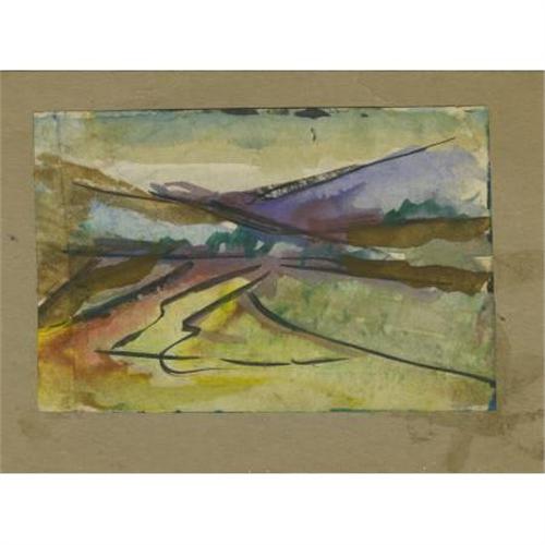 <B>Josephine Mahaffey</B></I> (American 1903-1982)<B><BR></B></I><I>Mountain Landscape</B></I><BR>Watercolor on paper, mounted on cardboard<BR>5-1/4 x 7-1/4 inches (13.3 x 18.4 cm)<BR>Unsigned<BR> <BR>Josephine Mahaffey attended the College of Industrial Arts (now Texas Woman's University) and after graduation continued her studies with Sallie Blythe Mummert. Additional instruction was with Clinton King, Octavio Medellin, Kathleen Lawrence, and John Erickson. For many years she ran her own art gallery in Azle and taught watercolor classes in Fort Worth. Josephine was a fixture at Fair Park and the State Fair of Texas selling her art. In 1968, she was honored with the naming of "Josephine Mahaffey Day" at the State Fair of Texas.<BR><BR> <B>Condition Report:</B> Creases to paper, surface residue to cardboard.<BR><BR><b>Shipping:</b> Flat Material, Small (<a target="_blank" href="http://www.heritageauctions.com/common/shipping.php">view shipping information</a>)