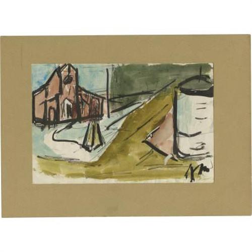<B>Josephine Mahaffey</B></I> (American 1903-1982)<B><BR></B></I><I>Landscape with Church</B></I><BR>Watercolor on paper, mounted on mat board<BR>8 x 11 inches (20.3 x 27.9 cm)<BR>Signed lower right <I>JM<BR></B></I> <BR>Josephine Mahaffey attended the College of Industrial Arts (now Texas Woman's University) and after graduation continued her studies with Sallie Blythe Mummert. Additional instruction was with Clinton King, Octavio Medellin, Kathleen Lawrence, and John Erickson. For many years she ran her own art gallery in Azle and taught watercolor classes in Fort Worth. Josephine was a fixture at Fair Park and the State Fair of Texas selling her art. In 1968, she was honored with the naming of "Josephine Mahaffey Day" at the State Fair of Texas.<BR><BR> <B>Condition Report:</B> Minor loss to paper at upper right edge.<BR><BR><b>Shipping:</b> Flat Material, Small (<a target="_blank" href="http://www.heritageauctions.com/common/shipping.php">view shipping information</a>)