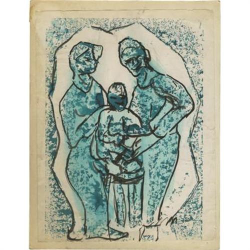 <B>Josephine Mahaffey</B></I> (American 1903-1982)<B><BR></B></I><I>Portrait of a Family</B></I><BR>Watercolor on paper, mounted on mat board<BR>12 x 9 inches (30.5 x 22.9 cm)<BR>Signed lower right <I>JM<BR></B></I> <BR>Josephine Mahaffey attended the College of Industrial Arts (now Texas Woman's University) and after graduation continued her studies with Sallie Blythe Mummert. Additional instruction was with Clinton King, Octavio Medellin, Kathleen Lawrence, and John Erickson. For many years she ran her own art gallery in Azle and taught watercolor classes in Fort Worth. Josephine was a fixture at Fair Park and the State Fair of Texas selling her art. In 1968, she was honored with the naming of "Josephine Mahaffey Day" at the State Fair of Texas.<BR><BR> <B>Condition Report:</B> Some creasing to paper.<BR><BR><b>Shipping:</b> Flat Material, Small (<a target="_blank" href="http://www.heritageauctions.com/common/shipping.php">view shipping information</a>)