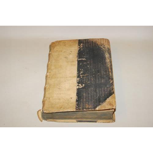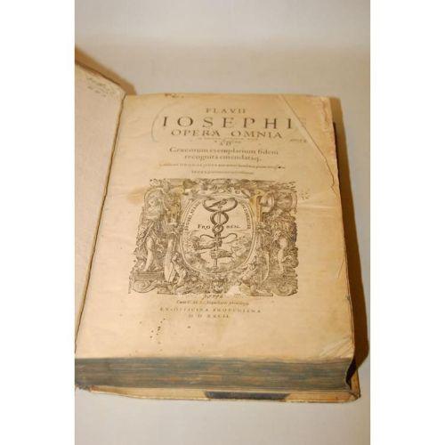Josephus, Flavius. Opera Omnia. Frobenius, 1582. Folio - over 12" - 15" tall. Hard & Soft Covers. Ex-Library. Good Condition. Flavii Iosephi Opera Omnia AD Graecorum Exemplarium Fidem Recognita Emendataq. Cum CAES Maiestatis Priuilegio. Title with woodcut vignette & publisher's device [1] 3 leaves, 627pp [1] 21 leaves Index. Bound in 3/4 blind stamped vellum & paper, raised bands on spine. Annotated. Lacks free end papers, one corner lacks vellum, covers show edge/corner wear/tear, front hinge cracked, light upper edge damp mark (not affecting the text), binding tight.