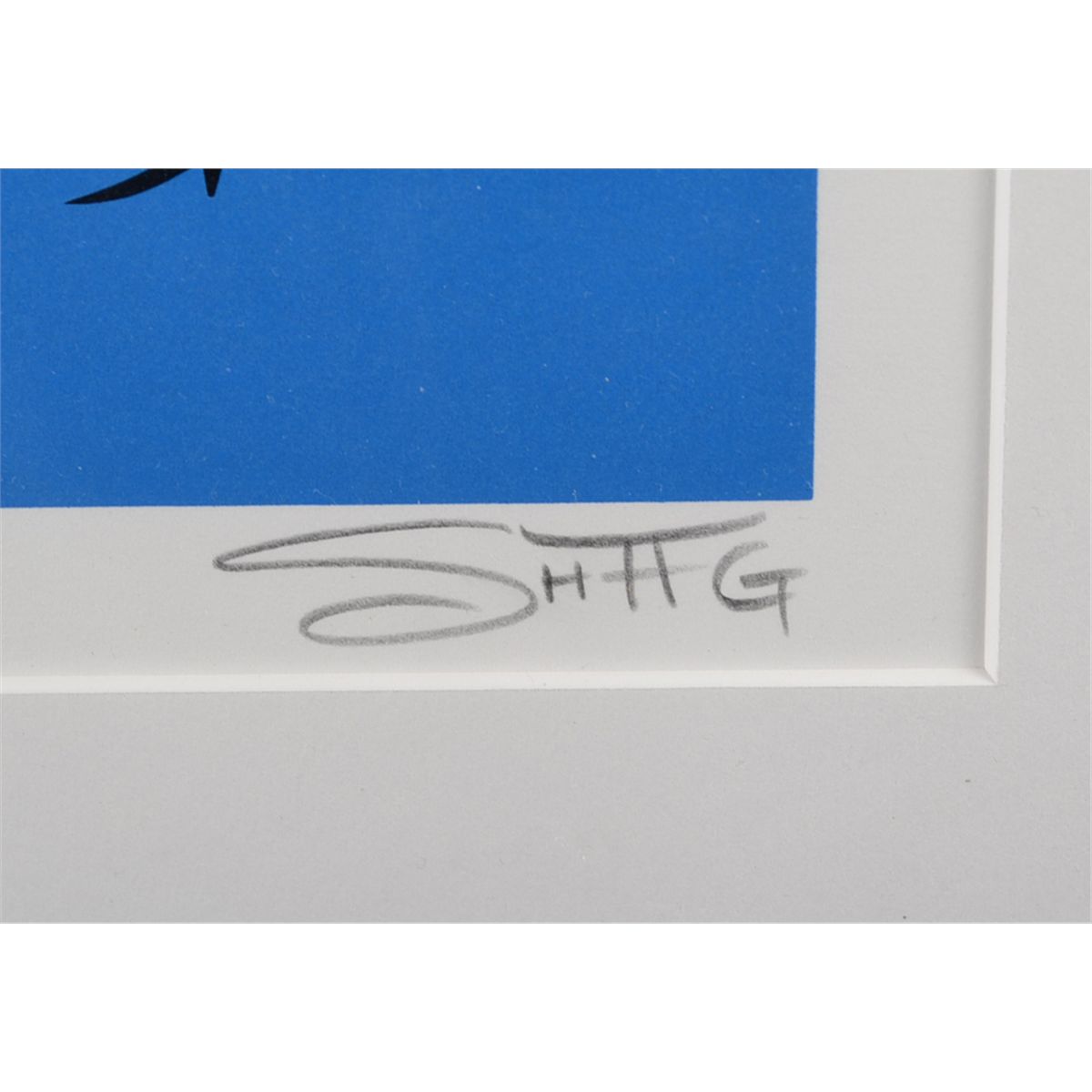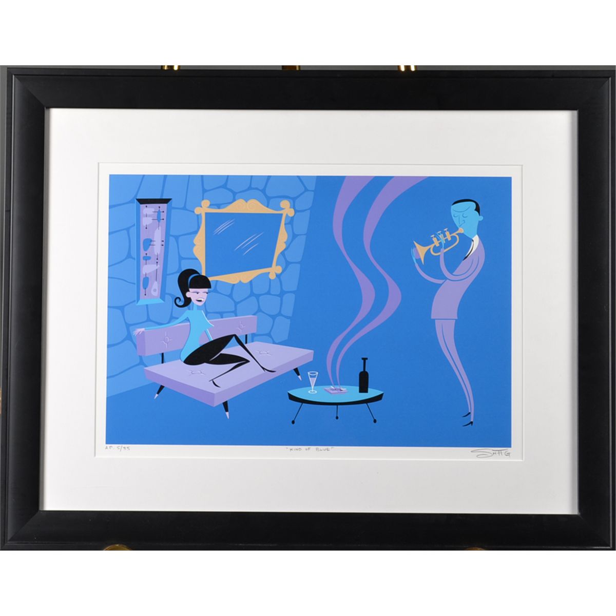 Titled "Kind of Blue," Artist Proof 5/45, pencil signed LR. Depicting a musician and his lady. Josh Agle (1962-) was a California and Hawaii artist known for his commerical art, record labels and comical satire. 13.5" H x 20" W, sight, 24.25" H x 30.75" W, framed. Circa late 20th century. Private collection Clinton Twp., MI.