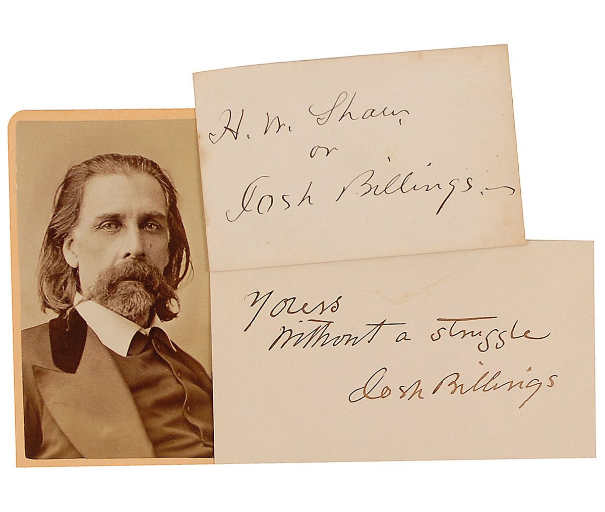 Pseudonym of American humorist Henry Wheeler Shaw (1818–1885). Ink signature, “H. W. Shaw or Josh Billings,” on an off-white 3.5 x 2.25 card; and another ink signature, “Yours without a struggle, Josh Billings,” on a 4.25 x 2.5 off-white card. In fine condition, with some scattered light toning to cards. Accompanied by an unsigned original carte-de-visite portrait of Billings by Gurney.