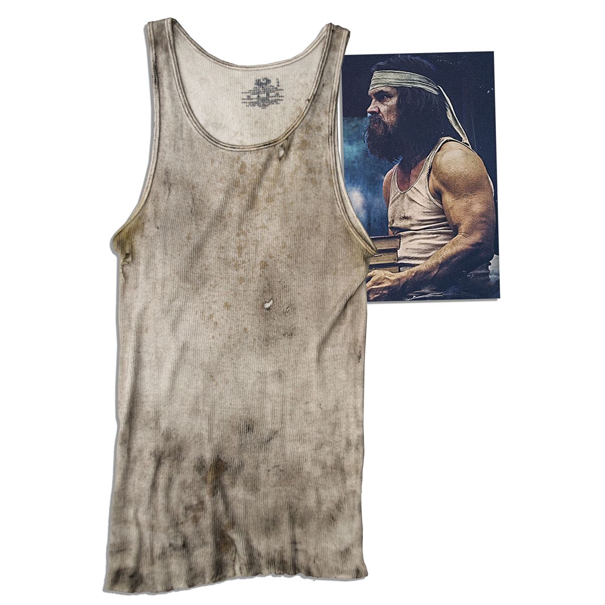 Josh Brolin screen-worn ribbed tank top from the Spike Lee thriller ''Oldboy''. Shirt by Fruit of the Loom in size L is purposely tattered with holes and allover stains. With a COA from Premiere Props.