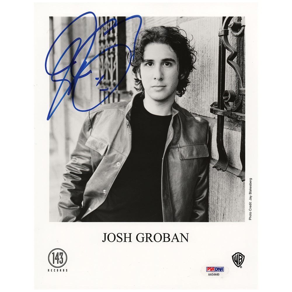 Glossy 8 x 10 Warner Records publicity photo of Josh Groban, signed in blue felt tip by the popular singer. In fine condition, with a PSA/DNA label affixed to the lower corner (certificate of authenticity not present).