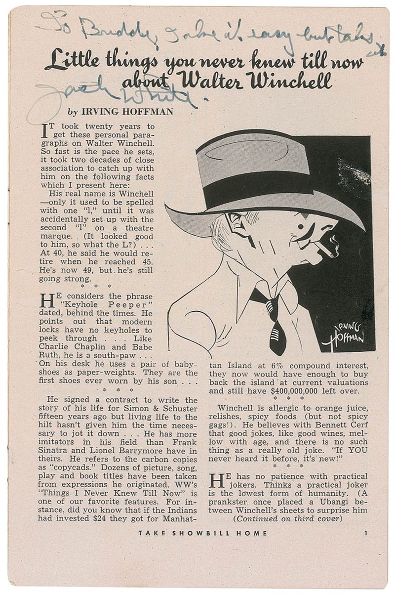 Noted African-American blues guitarist and singer (1914–1969). His political activism in the 1940s resulted in his being blacklisted, which in turn led to his still-controversial testimony before the notorious House Un-American Activities Committee. Program for the Cafe Society, 5.5 x 8.5, 13 pages, signed and inscribed on the first page, “To Buddy, Take it easy but take it, Josh White.” In very good condition, with scattered creases and soiling, slight separation to the top of the cover, and parts of the signature and inscription a shade light.