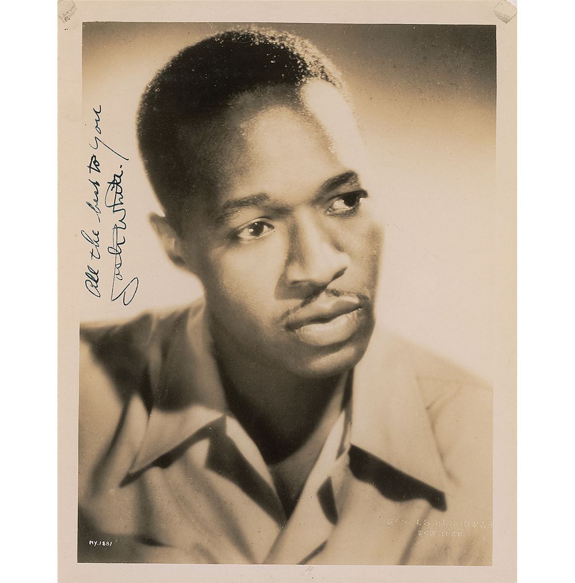 Noted African-American blues guitarist and singer (1914–1969). His political activism in the 1940s resulted in his being blacklisted, which in turn led to his still-controversial testimony before the notorious House Un-American Activities Committee. Vintage glossy 8 x 10 head-and-shoulders photo of White, vertically signed against the light background in fountain pen, “All the best to you, Josh White.” In fine condition, with tape remnants to upper corners.
