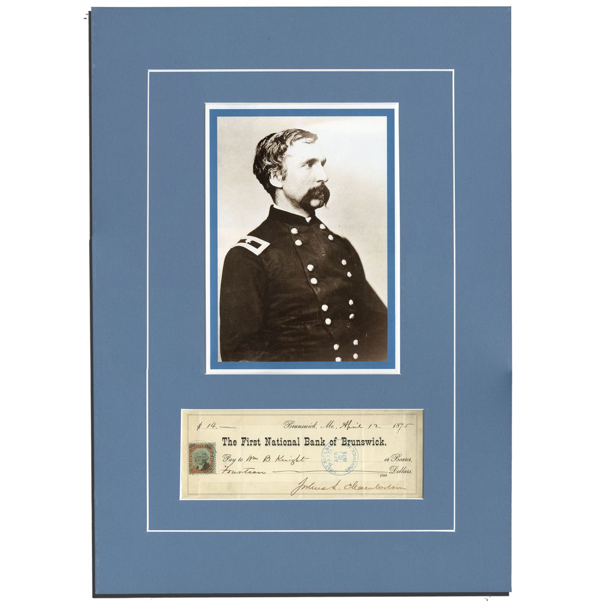 Joshua Chamberlain check signed. The Gettysburg hero signs ''Joshua L. Chamberlain'' to a First National Bank of Brunswick check, dated 12 April 1875 and made payable to one ''Wm B. Knight'' in the amount of $14.00. Toning, else fine. 7.75'' x 3'' check is attractively mounted and matted with a photo of Chamberlain to an overall size of 13'' x 18.5''. Near fine.